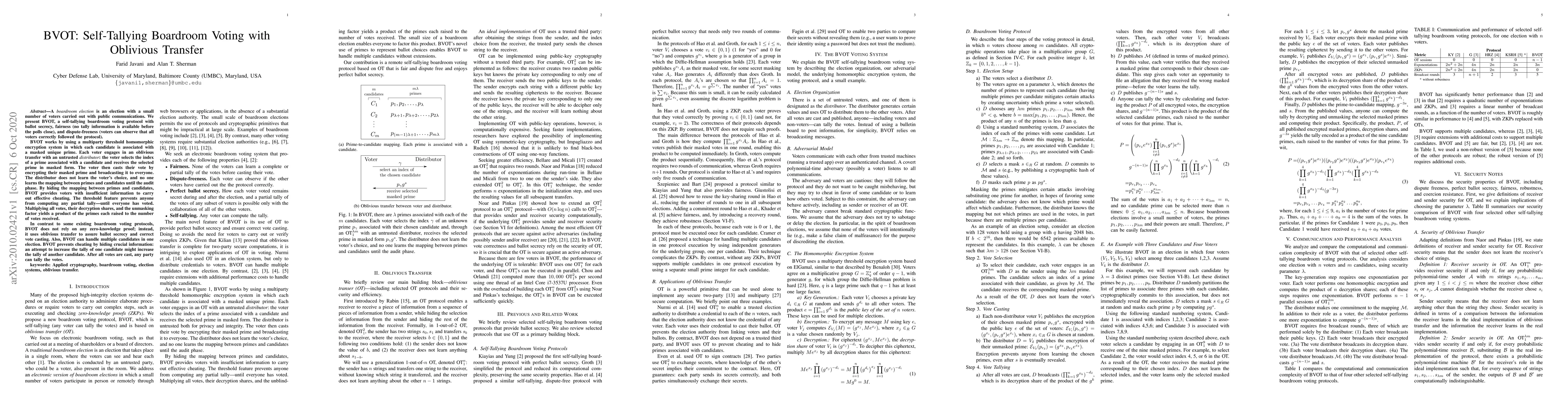 BVOT is a self-tallying boardroom voting protocol that ensures ballot secrecy, fairness, and dispute-freeness using multiparty threshold homomorphic encryption and oblivious transfer. It prevents cheating by hiding the mapping between primes and candidates, ensuring no partial tally until all votes are cast.