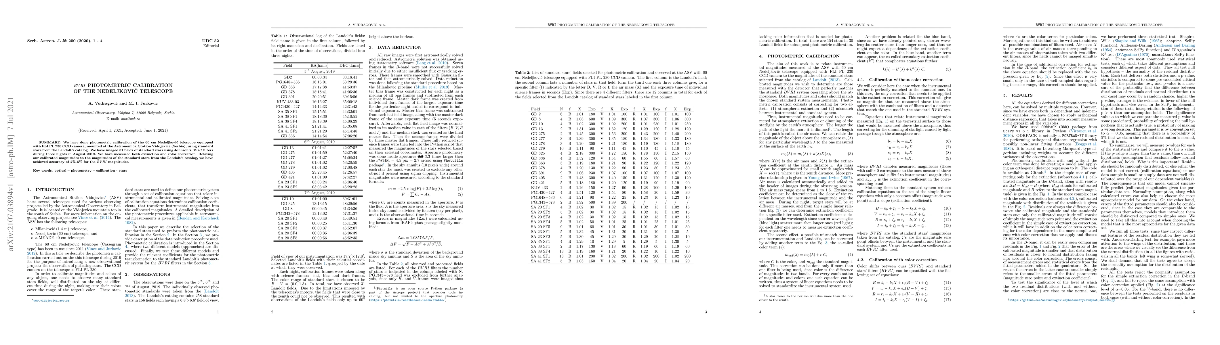 We have done photometric calibration of the 60 cm Nedeljkovi\'{c} telescope equipped with FLI PL 230 CCD camera, mounted at the Astronomical Station Vidojevica (Serbia), using standard stars from the Landolt's catalog. We have imaged 31 fields of standard stars using Johnson's $BVRI$ filters during three nights in August 2019. We have measured both extinction and color correction. Relating our calibrated magnitudes to the magnitudes of the standard stars from the Landolt's catalog, we have achieved accuracy of 2\%-5\% for the $BVRI$ magnitudes.