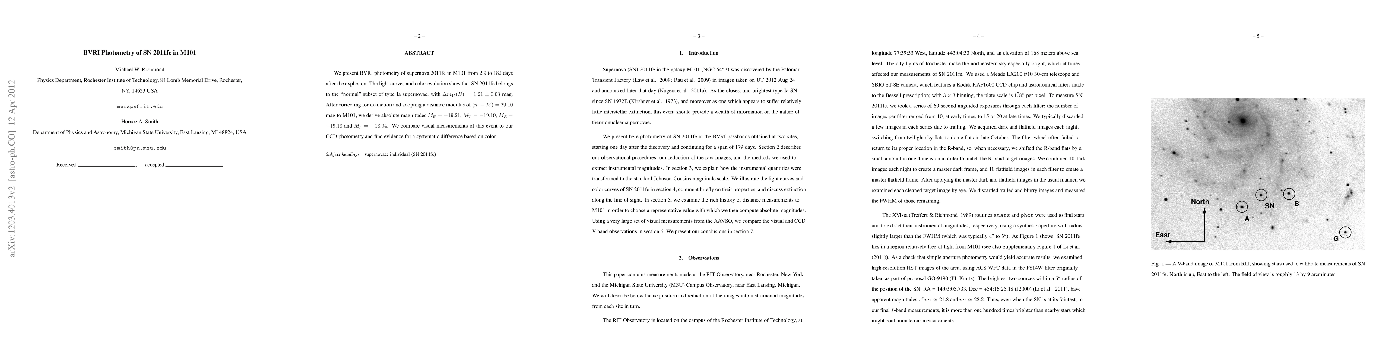 This work is notable for its comprehensive BVRI photometry of SN 2011fe and the systematic comparison of visual and CCD measurements, providing insights into the consistency and potential systematic differences between the two observation methods.