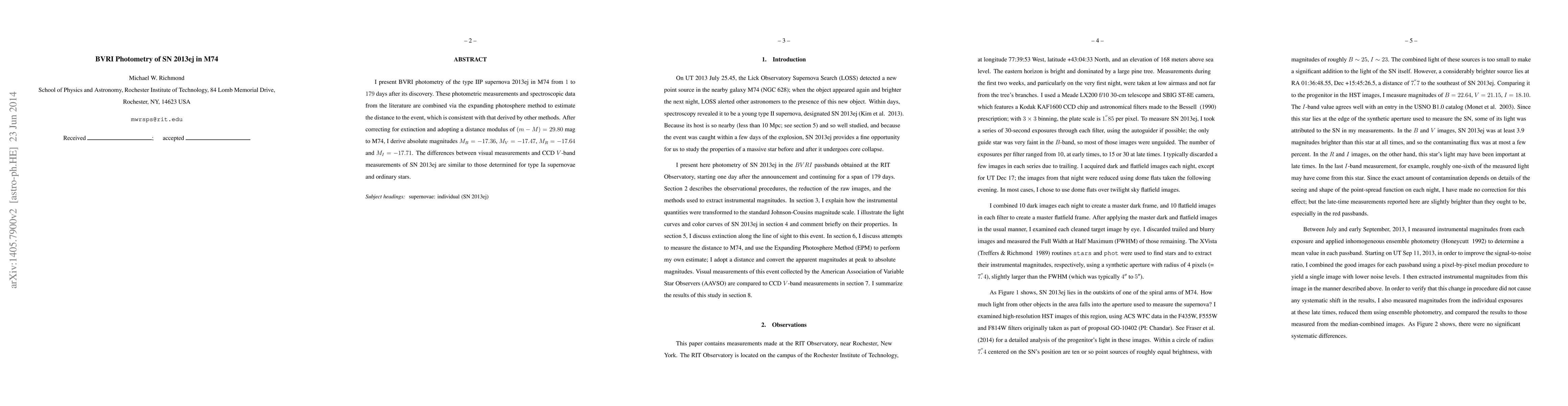 This research paper presents BVRI photometry of SN 2013ej in M74, estimating its distance and absolute magnitudes consistent with other methods, and highlights similarities between visual measurements and type Ia supernovae.
