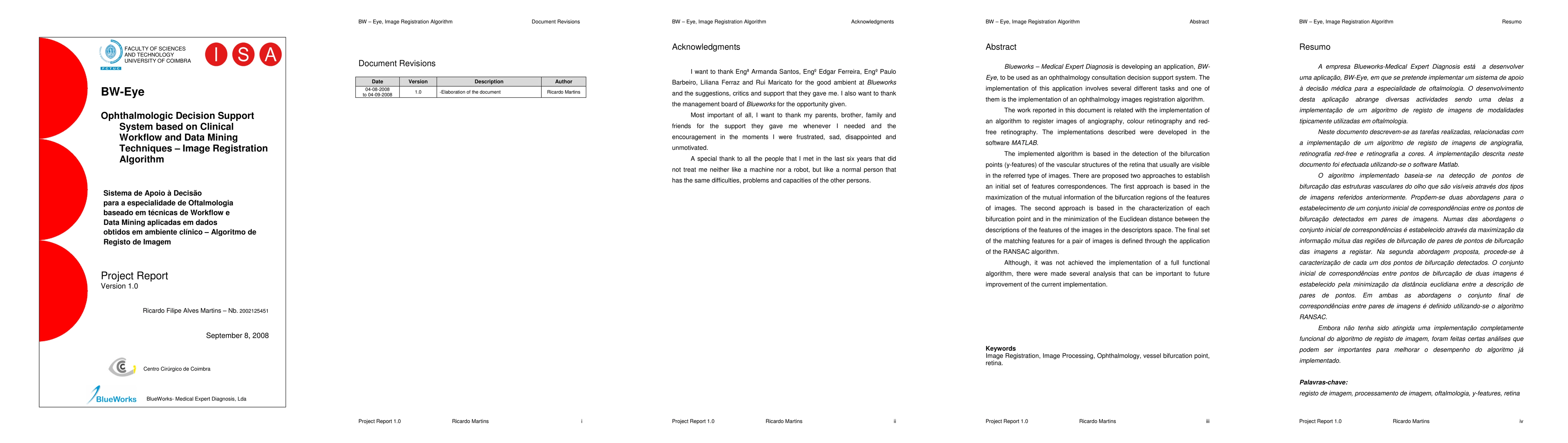 Blueworks - Medical Expert Diagnosis is developing an application, BWEye, to be used as an ophthalmology consultation decision support system. The implementation of this application involves several different tasks and one of them is the implementation of an ophthalmology images registration algorithm. The work reported in this document is related with the implementation of an algorithm to register images of angiography, colour retinography and redfree retinography. The implementations described were developed in the software MATLAB. The implemented algorithm is based in the detection of the bifurcation points (y-features) of the vascular structures of the retina that usually are visible in the referred type of images. There are proposed two approaches to establish an initial set of features correspondences. The first approach is based in the maximization of the mutual information of the bifurcation regions of the features of images. The second approach is based in the characterization of each bifurcation point and in the minimization of the Euclidean distance between the descriptions of the features of the images in the descriptors space. The final set of the matching features for a pair of images is defined through the application of the RANSAC algorithm. Although, it was not achieved the implementation of a full functional algorithm, there were made several analysis that can be important to future improvement of the current implementation.