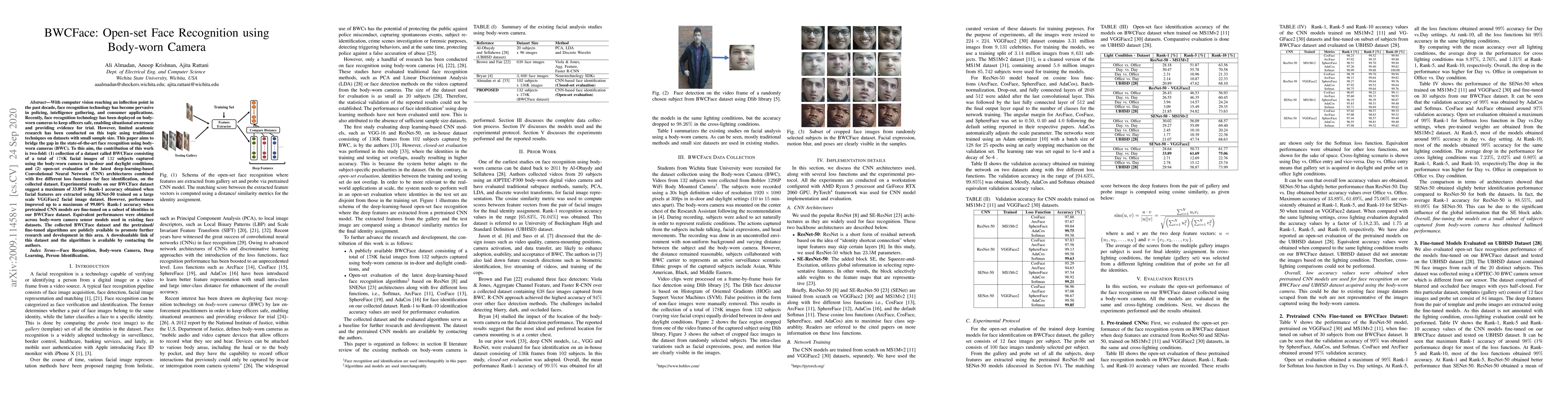This paper introduces the BWCFace dataset, comprising 178K facial images from body-worn cameras, and evaluates deep-learning-based CNNs for open-set face recognition. The best performing model achieved 99.00% Rank-1 accuracy when fine-tuned on a subset of the dataset.