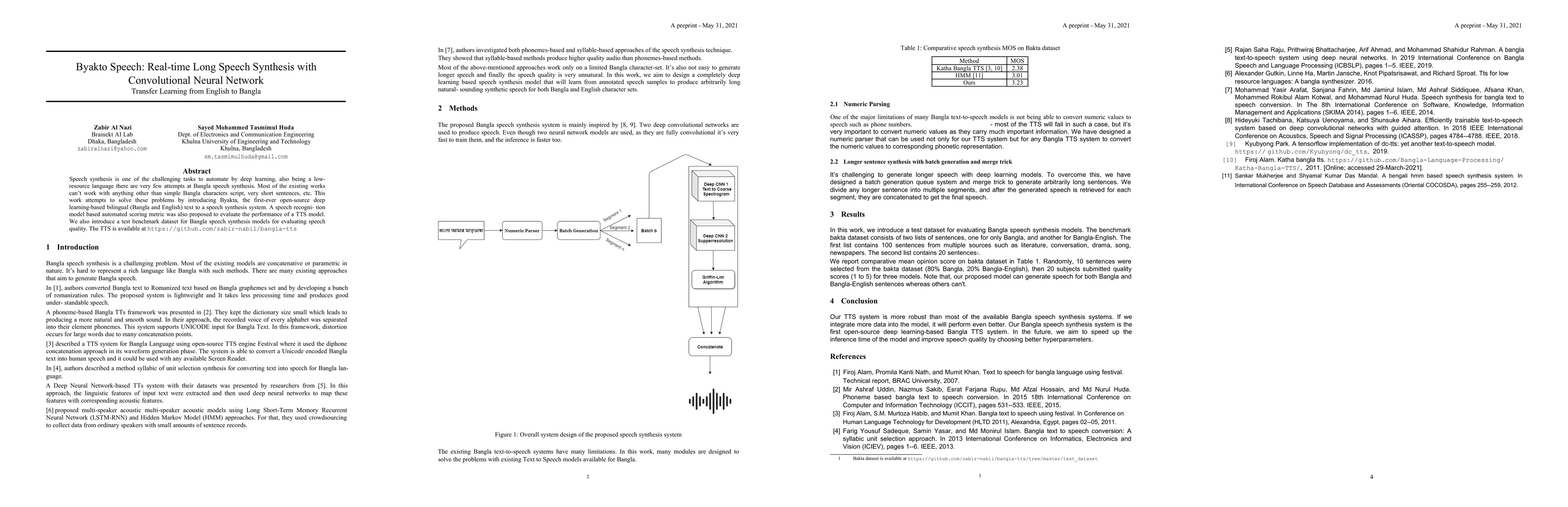 This paper presents Byakta, a novel open-source deep learning-based text-to-speech system for Bangla, enabling real-time long speech synthesis through transfer learning from English. It also introduces a new benchmark dataset and an automated scoring metric for evaluating Bangla TTS models.