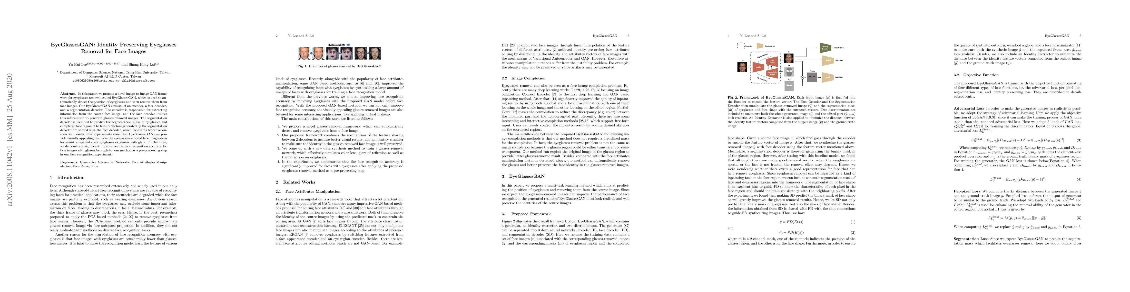 In this paper, we propose a novel image-to-image GAN framework for eyeglasses removal, called ByeGlassesGAN, which is used to automatically detect the position of eyeglasses and then remove them from face images. Our ByeGlassesGAN consists of an encoder, a face decoder, and a segmentation decoder. The encoder is responsible for extracting information from the source face image, and the face decoder utilizes this information to generate glasses-removed images. The segmentation decoder is included to predict the segmentation mask of eyeglasses and completed face region. The feature vectors generated by the segmentation decoder are shared with the face decoder, which facilitates better reconstruction results. Our experiments show that ByeGlassesGAN can provide visually appealing results in the eyeglasses-removed face images even for semi-transparent color eyeglasses or glasses with glare. Furthermore, we demonstrate significant improvement in face recognition accuracy for face images with glasses by applying our method as a pre-processing step in our face recognition experiment.