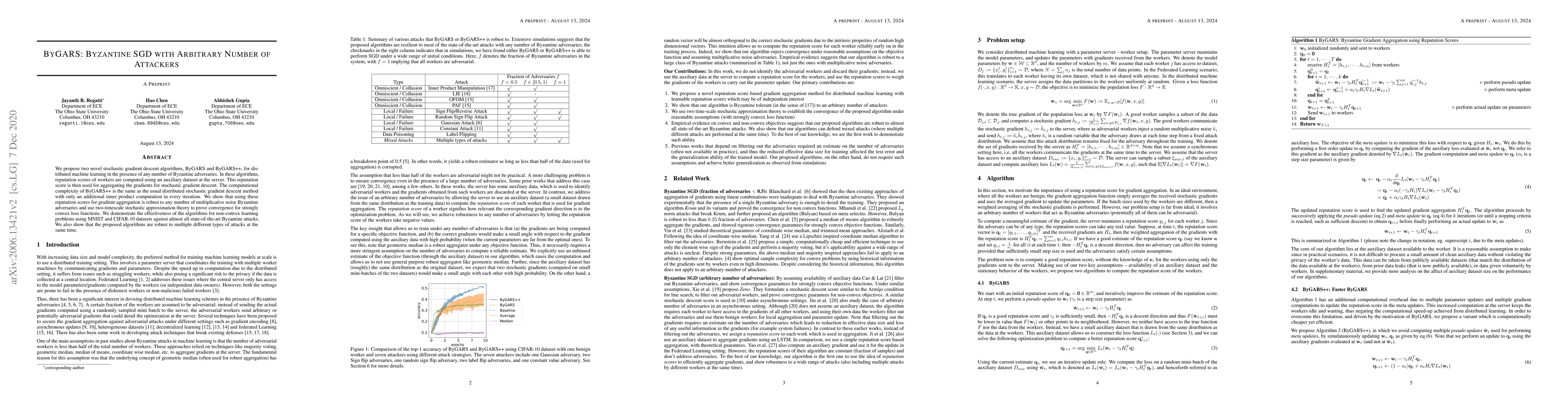 We propose two novel stochastic gradient descent algorithms, ByGARS and ByGARS++, for distributed machine learning in the presence of any number of Byzantine adversaries. In these algorithms, reputation scores of workers are computed using an auxiliary dataset at the server. This reputation score is then used for aggregating the gradients for stochastic gradient descent. The computational complexity of ByGARS++ is the same as the usual distributed stochastic gradient descent method with only an additional inner product computation in every iteration. We show that using these reputation scores for gradient aggregation is robust to any number of multiplicative noise Byzantine adversaries and use two-timescale stochastic approximation theory to prove convergence for strongly convex loss functions. We demonstrate the effectiveness of the algorithms for non-convex learning problems using MNIST and CIFAR-10 datasets against almost all state-of-the-art Byzantine attacks. We also show that the proposed algorithms are robust to multiple different types of attacks at the same time.