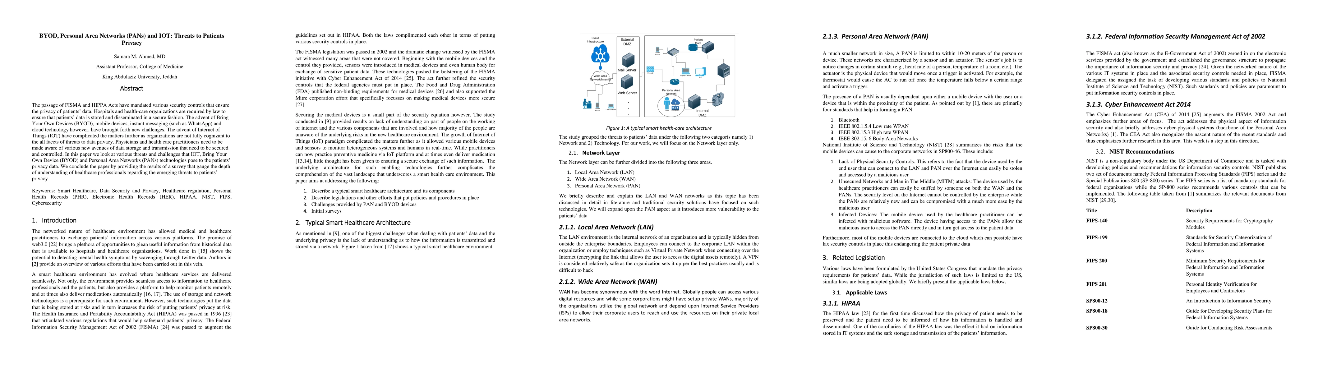 This paper examines the threats to patient privacy posed by Bring Your Own Device (BYOD), Personal Area Networks (PANs), and Internet of Things (IoT) technologies in healthcare settings. It highlights the challenges these technologies bring to compliance with security mandates like FISMA and HIPAA, and concludes with a survey on healthcare professionals' awareness of these emerging privacy risks.