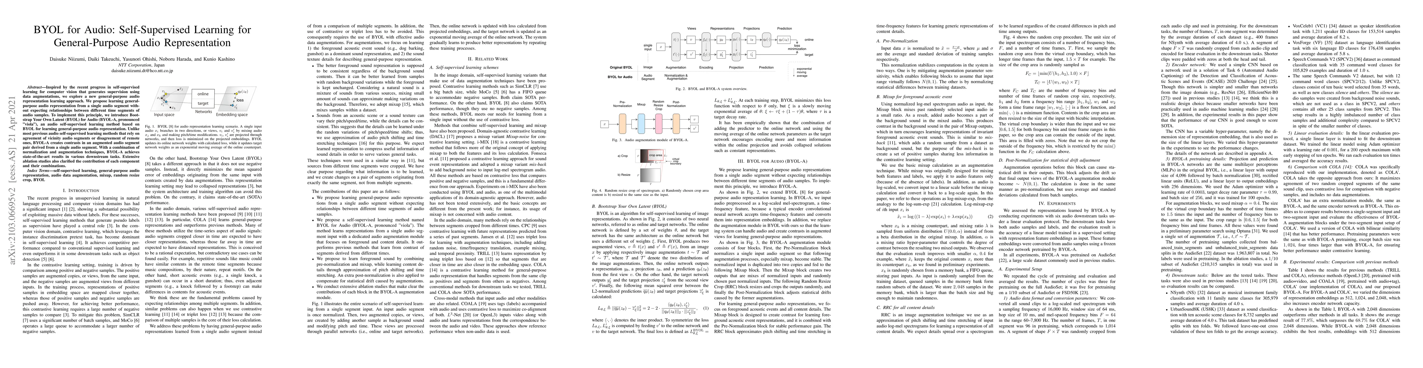 This paper proposes BYOL-A, a self-supervised learning method for general-purpose audio representation, which contrasts augmented versions of a single audio segment. BYOL-A achieves state-of-the-art results in various downstream tasks, demonstrating the effectiveness of its normalization and augmentation techniques.