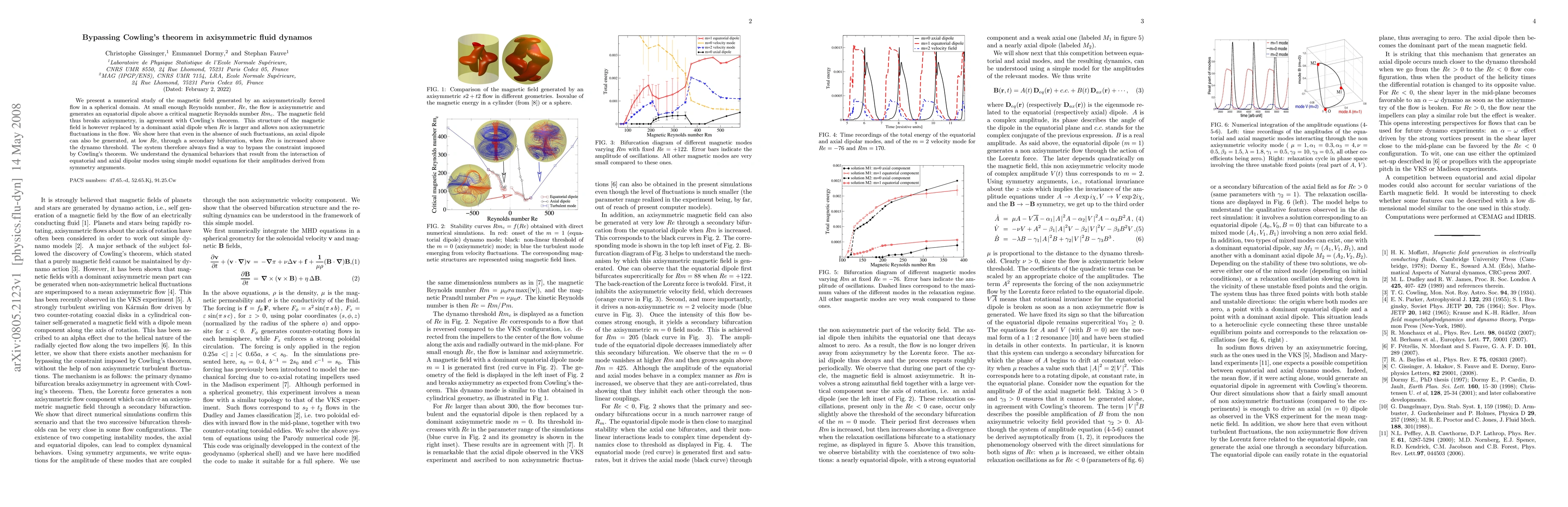 We present a numerical study of the magnetic field generated by an axisymmetrically forced flow in a spherical domain. At small enough Reynolds number, Re, the flow is axisymmetric and generates an equatorial dipole above a critical magnetic Reynolds number Rmc . The magnetic field thus breaks axisymmetry, in agreement with Cowling's theorem. This structure of the magnetic field is however replaced by a dominant axial dipole when Re is larger and allows non axisymmetric fluctuations in the flow. We show here that even in the absence of such fluctuations, an axial dipole can also be generated, at low Re, through a secondary bifurcation, when Rm is increased above the dynamo threshold. The system therefore always find a way to bypass the constraint imposed by Cowling's theorem. We understand the dynamical behaviors that result from the interaction of equatorial and axial dipolar modes using simple model equations for their amplitudes derived from symmetry arguments.