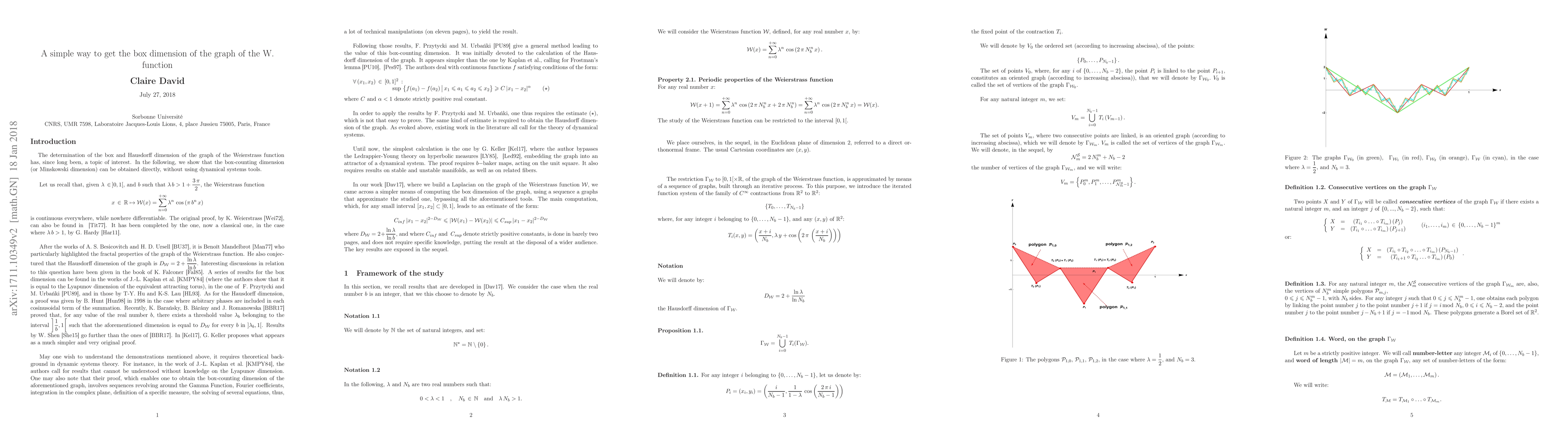 In the following, bypassing dynamical systems tools, we propose a simple means of computing the box dimension of the graph of the classical Weierstrass function defined, for any real number~$x$, by~$ {\cal W}(x)=\displaystyle \sum_{n=0}^{+\infty} \lambda^n\,\cos \left ( 2\, \pi\,N_b^n\,x \right) $, where~$\lambda$ and~$N_b$ are two real numbers such that~\mbox{$0 <\lambda<1$},~\mbox{$ N_b\,\in\,\N$} and~$ \lambda\,N_b > 1 $, using a sequence a graphs that approximate the studied one.