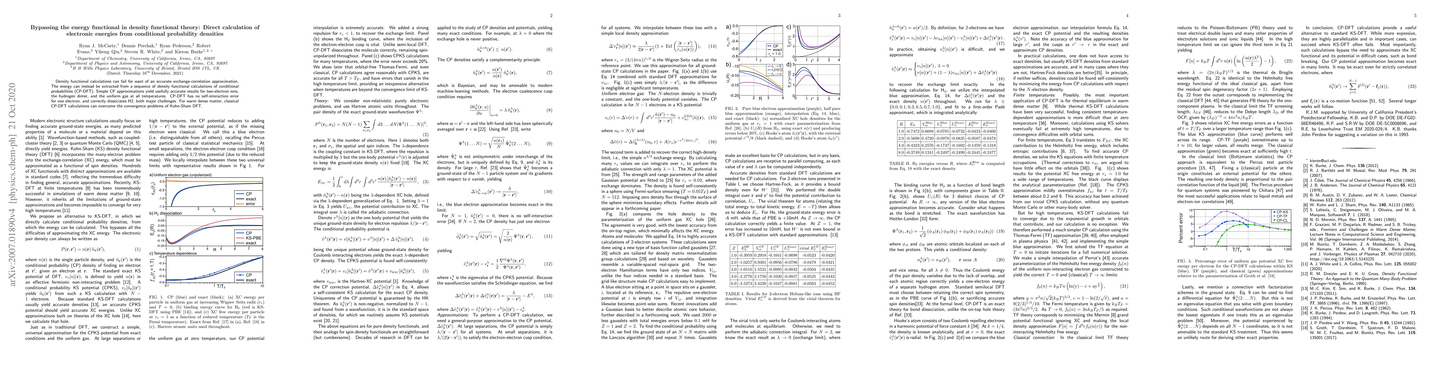 Density functional calculations can fail for want of an accurate exchange-correlation approximation. The energy can instead be extracted from a sequence of density functional calculations of conditional probabilities (CP-DFT). Simple CP approximations yield usefully accurate results for two-electron ions, the hydrogen dimer, and the uniform gas at all temperatures. CP-DFT has no self-interaction error for one electron, and correctly dissociates H2, both major challenges. For warm dense matter, classical CP-DFT calculations can overcome the convergence problems of Kohn-Sham DFT.