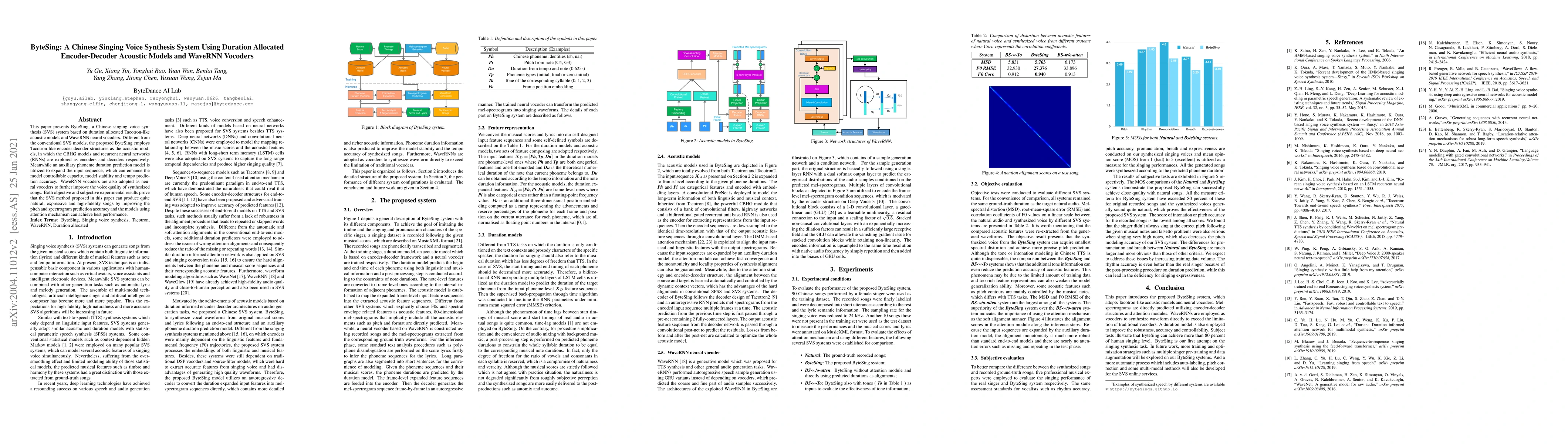 ByteSing is a Chinese singing voice synthesis system utilizing duration-allocated encoder-decoder acoustic models and WaveRNN vocoders to produce natural, expressive, and high-fidelity songs, achieving improved pitch and spectrogram prediction accuracy. The system employs Tacotron-like structures and an auxiliary duration prediction model to enhance model stability and tempo prediction.