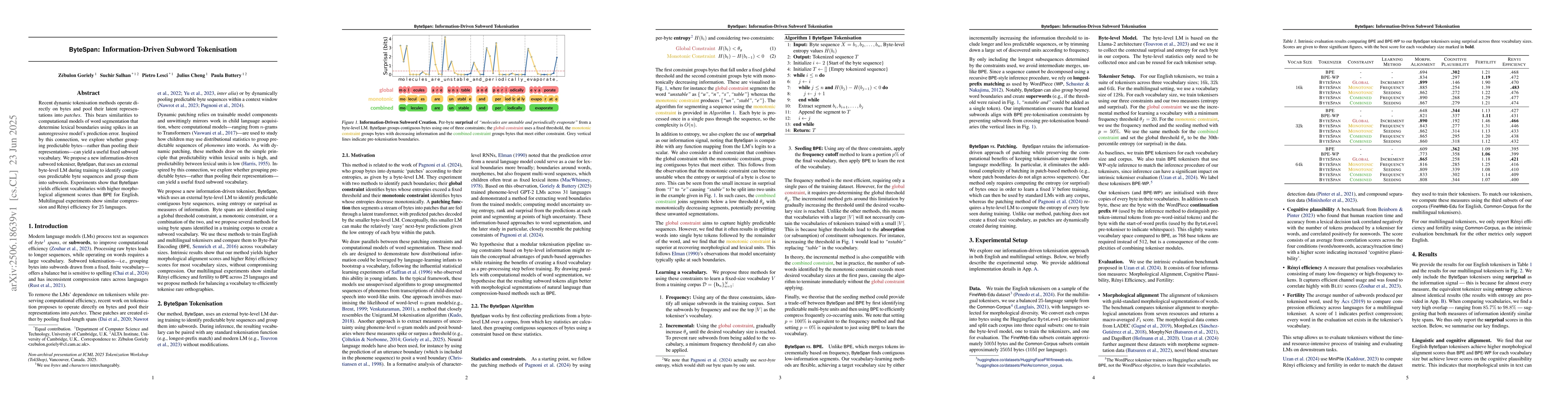 Recent dynamic tokenisation methods operate directly on bytes and pool their latent representations into patches. This bears similarities to computational models of word segmentation that determine lexical boundaries using spikes in an autoregressive model's prediction error. Inspired by this connection, we explore whether grouping predictable bytes - rather than pooling their representations - can yield a useful fixed subword vocabulary. We propose a new information-driven subword tokeniser, ByteSpan, that uses an external byte-level LM during training to identify contiguous predictable byte sequences and group them into subwords. Experiments show that ByteSpan yields efficient vocabularies with higher morphological alignment scores than BPE for English. Multilingual experiments show similar compression and R\'enyi efficiency for 25 languages.