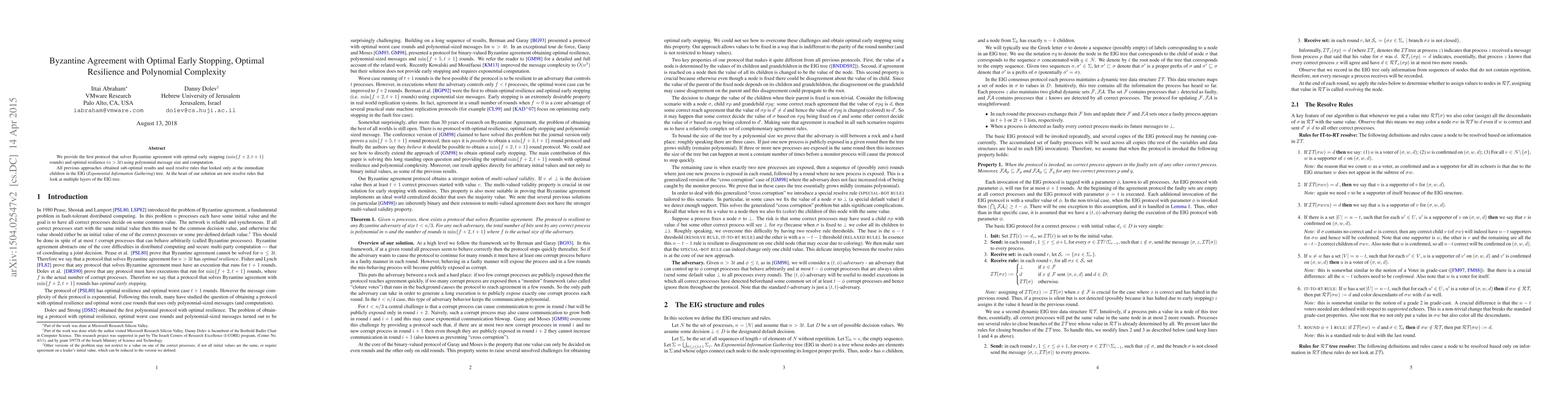 This paper presents a novel Byzantine agreement protocol achieving optimal early stopping and resilience with polynomial complexity. Unlike previous methods, it uses new resolve rules that analyze multiple layers of the Exponential Information Gathering tree to improve performance.