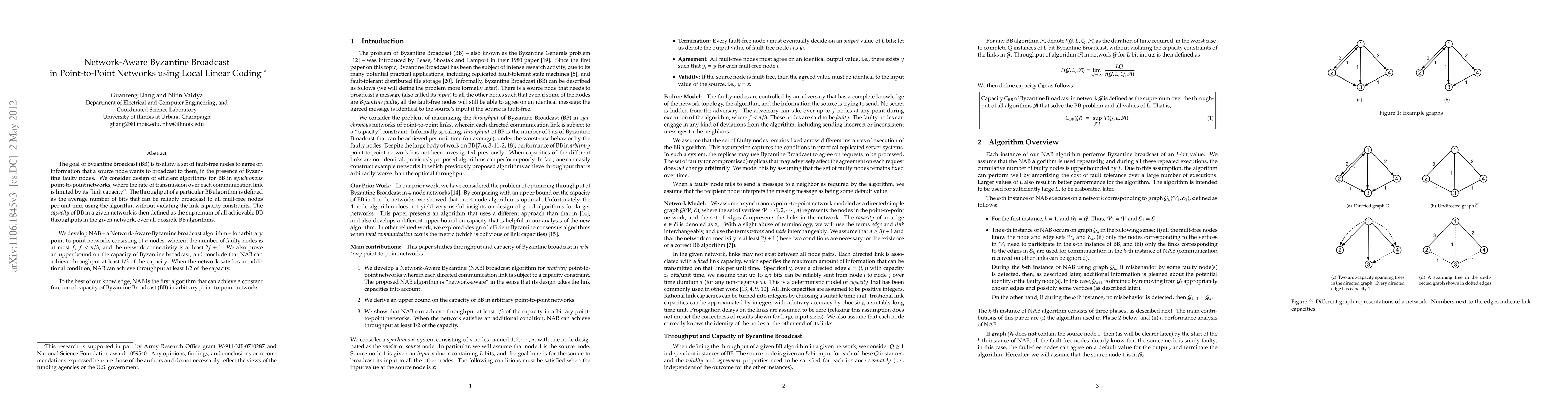 This paper introduces NAB, a Network-Aware Byzantine broadcast algorithm for point-to-point networks, achieving throughput at least 1/3 of the network's Byzantine broadcast capacity, and up to 1/2 under additional conditions. It is the first algorithm to attain a constant fraction of the broadcast capacity in arbitrary networks.