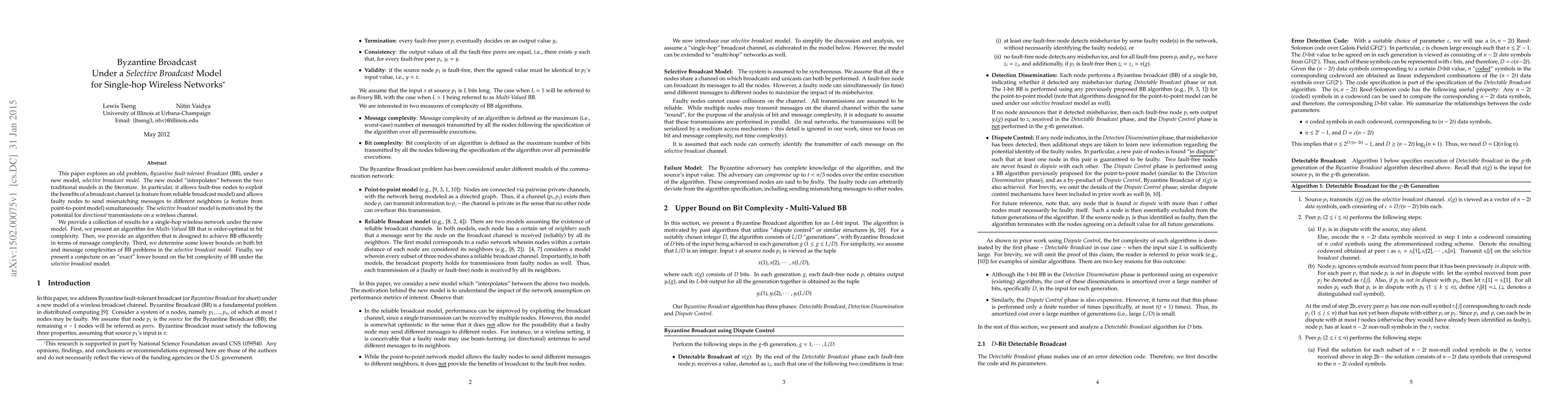 This paper explores an old problem, {\em Byzantine fault-tolerant Broadcast} (BB), under a new model, {\em selective broadcast model}. The new model "interpolates" between the two traditional models in the literature. In particular, it allows fault-free nodes to exploit the benefits of a broadcast channel (a feature from reliable broadcast model) and allows faulty nodes to send mismatching messages to different neighbors (a feature from point-to-point model) simultaneously. The {\em selective broadcast} model is motivated by the potential for {\em directional} transmissions on a wireless channel. We provide a collection of results for a single-hop wireless network under the new model. First, we present an algorithm for {\em Multi-Valued} BB that is order-optimal in bit complexity. Then, we provide an algorithm that is designed to achieve BB efficiently in terms of message complexity. Third, we determine some lower bounds on both bit and message complexities of BB problems in the {\em selective broadcast model}. Finally, we present a conjecture on an "exact" lower bound on the bit complexity of BB under the {\em selective broadcast} model.