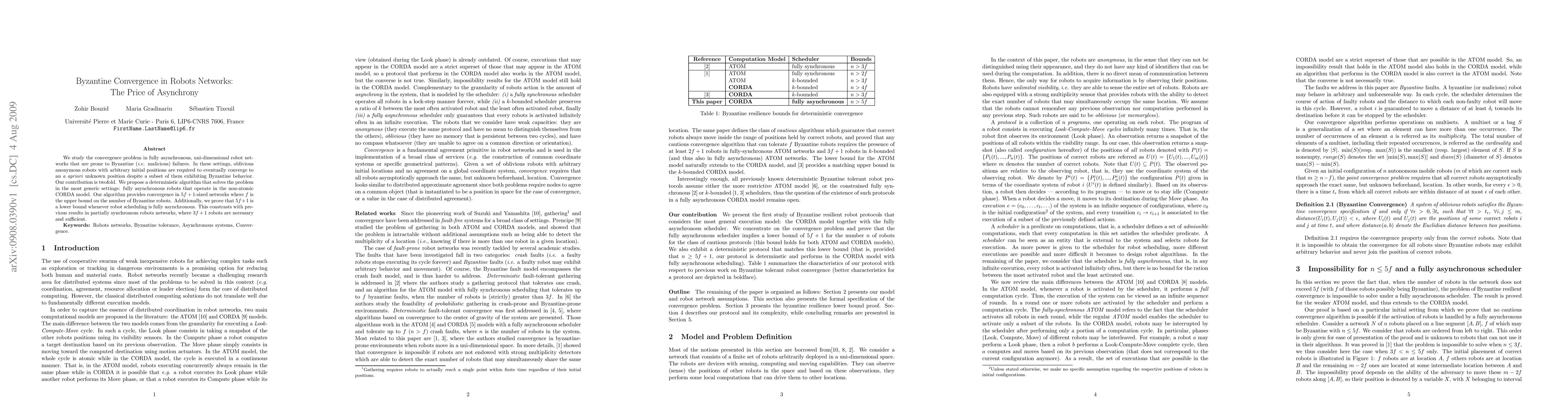 We study the convergence problem in fully asynchronous, uni-dimensional robot networks that are prone to Byzantine (i.e. malicious) failures. In these settings, oblivious anonymous robots with arbitrary initial positions are required to eventually converge to an a apriori unknown position despite a subset of them exhibiting Byzantine behavior. Our contribution is twofold. We propose a deterministic algorithm that solves the problem in the most generic settings: fully asynchronous robots that operate in the non-atomic CORDA model. Our algorithm provides convergence in 5f+1-sized networks where f is the upper bound on the number of Byzantine robots. Additionally, we prove that 5f+1 is a lower bound whenever robot scheduling is fully asynchronous. This constrasts with previous results in partially synchronous robots networks, where 3f+1 robots are necessary and sufficient.