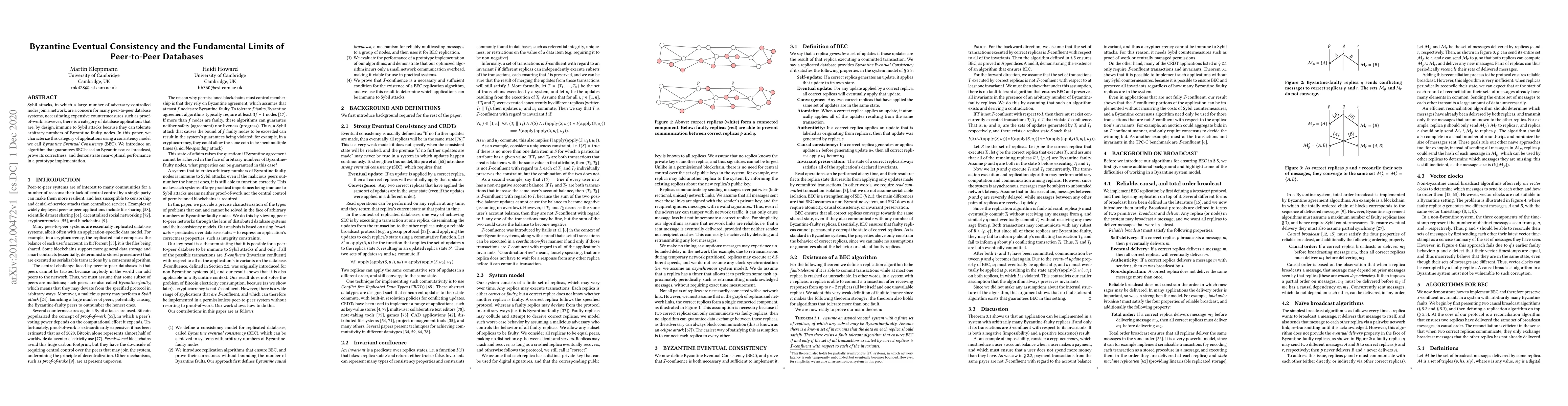This paper introduces Byzantine Eventual Consistency (BEC) as a consistency model for peer-to-peer databases that can tolerate arbitrary numbers of Byzantine-faulty nodes, presenting an algorithm for achieving BEC with near-optimal performance in a prototype implementation. The model addresses the challenge posed by Sybil attacks without requiring costly countermeasures.