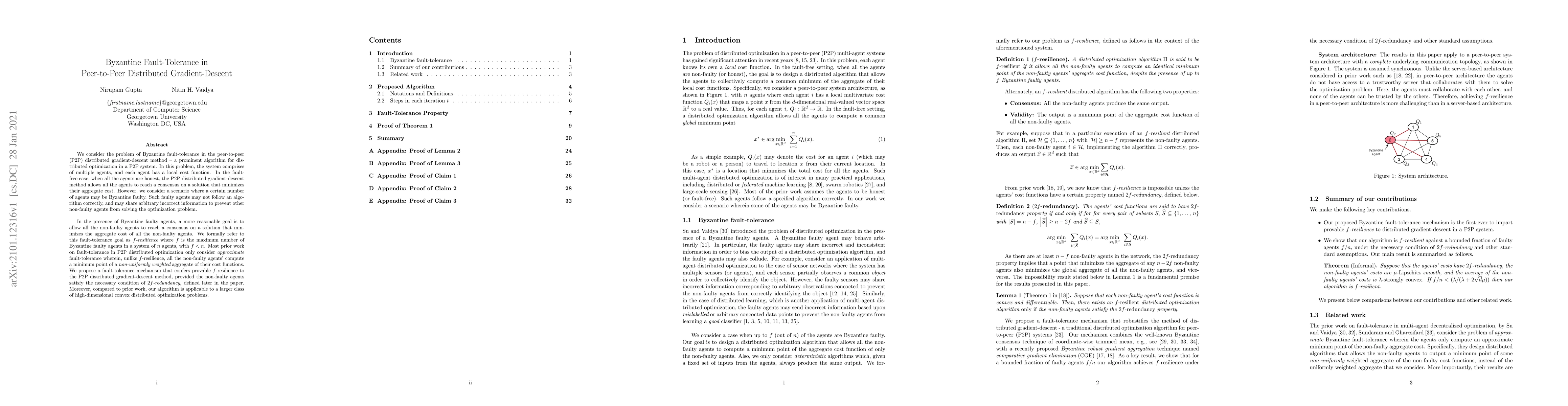 This paper addresses Byzantine fault-tolerance in peer-to-peer distributed gradient-descent, proposing an algorithm that ensures $f$-resilience where $f$ is the maximum number of faulty agents, compared to approximate fault-tolerance approaches. The proposed method guarantees non-faulty agents reach consensus on minimizing their aggregate cost under the condition of $2f$-redundancy.