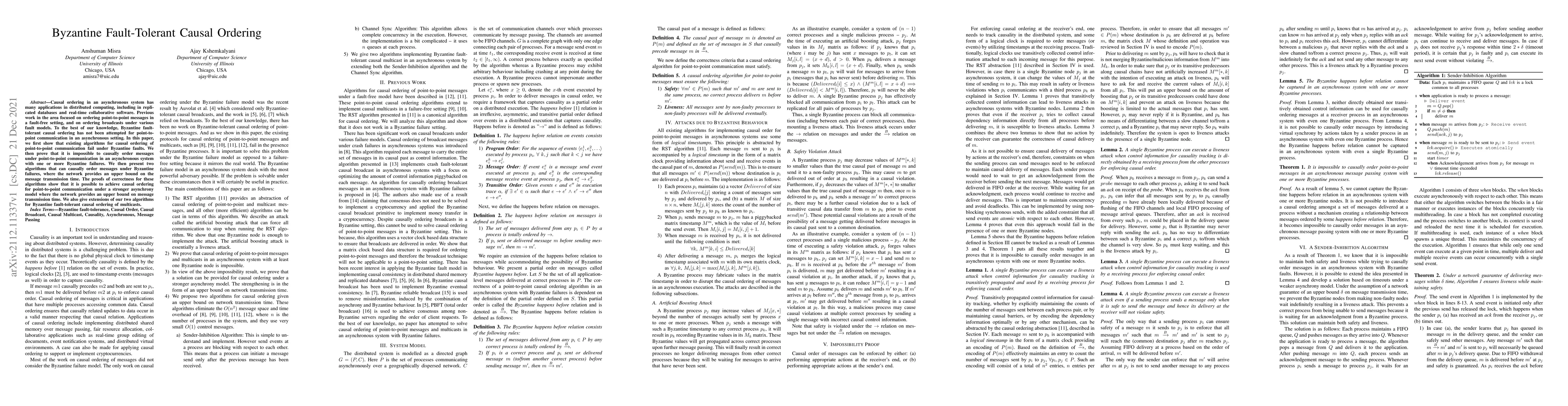 The paper presents a formal definition of Byzantine causal order and demonstrates a liveness attack on the canonical technique for implementing causal order in asynchronous systems with Byzantine faults. It proves the impossibility of implementing Byzantine fault-tolerant causal order for point-to-point messages in asynchronous systems due to the possibility of liveness attacks. The research then shows that causal order is achievable under a stronger asynchrony model with a network guarantee on message transmission time.