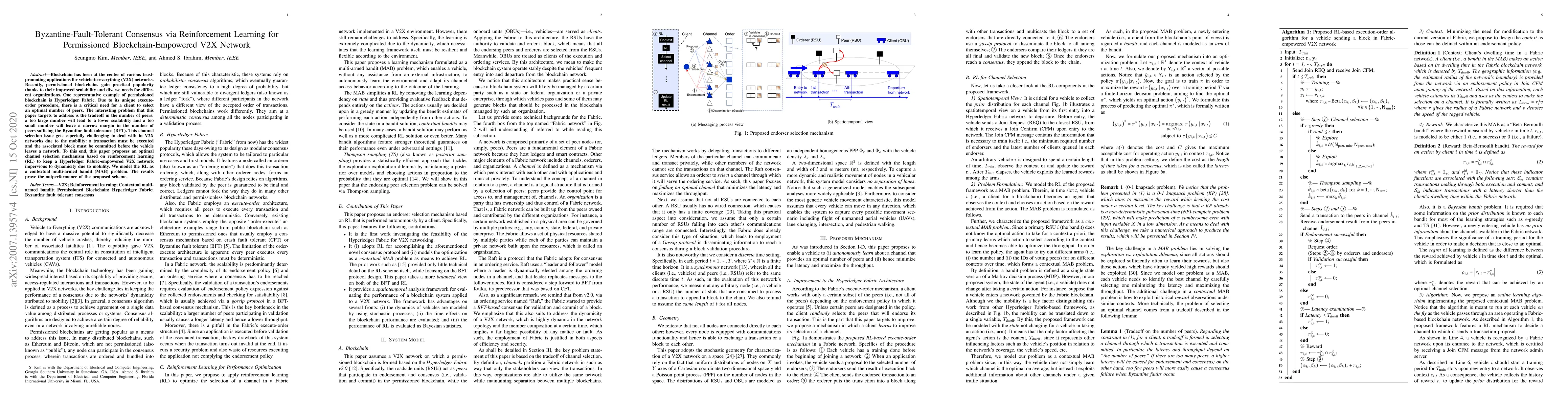 Blockchain has been forming the central piece of various types of vehicle-to-everything (V2X) network for trusted data exchange. Recently, permissioned blockchains garner particular attention thanks to their improved scalability and diverse needs from different organizations. One representative example of permissioned blockchain is Hyperledger Fabric ("Fabric"). Due to its unique execute-order procedure, there is a critical need for a client to select an optimal number of peers. The interesting problem that this paper targets to address is the tradeoff in the number of peers: a too large number will degrade scalability while a too small number will make the network vulnerable to faulty nodes. This optimization issue gets especially challenging in V2X networks due to mobility of nodes: a transaction must be executed and the associated block must be committed before the vehicle leaves a network. To this end, this paper proposes an optimal peers selection mechanism based on reinforcement learning (RL) to keep a Fabric-empowered V2X network impervious to dynamicity due to mobility. We model the RL as a contextual multi-armed bandit (MAB) problem. The results demonstrate the outperformance of the proposed scheme.