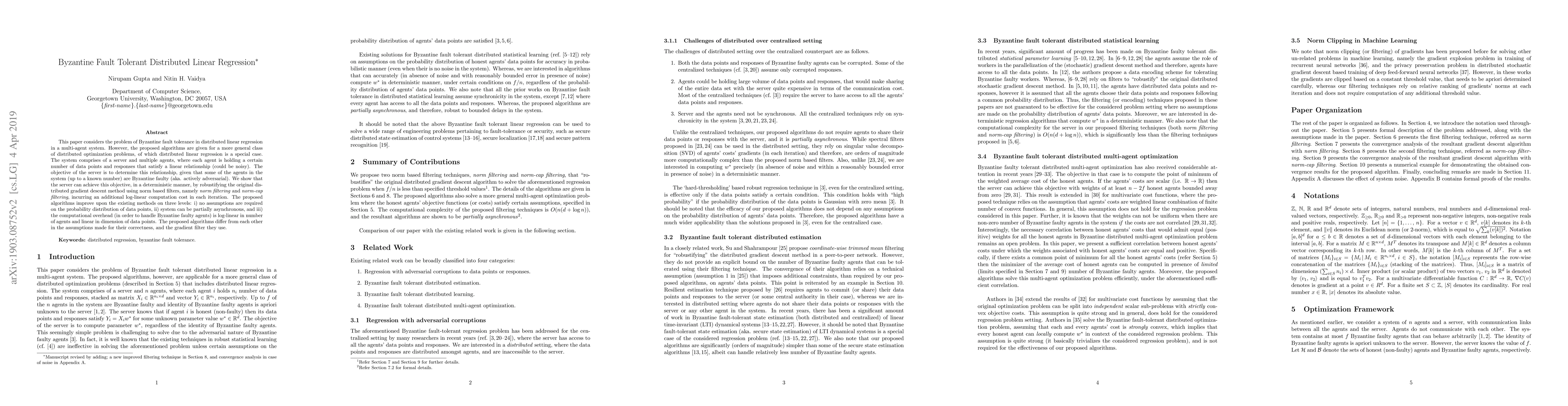 This paper considers the problem of Byzantine fault tolerance in distributed linear regression in a multi-agent system. However, the proposed algorithms are given for a more general class of distributed optimization problems, of which distributed linear regression is a special case. The system comprises of a server and multiple agents, where each agent is holding a certain number of data points and responses that satisfy a linear relationship (could be noisy). The objective of the server is to determine this relationship, given that some of the agents in the system (up to a known number) are Byzantine faulty (aka. actively adversarial). We show that the server can achieve this objective, in a deterministic manner, by robustifying the original distributed gradient descent method using norm based filters, namely 'norm filtering' and 'norm-cap filtering', incurring an additional log-linear computation cost in each iteration. The proposed algorithms improve upon the existing methods on three levels: i) no assumptions are required on the probability distribution of data points, ii) system can be partially asynchronous, and iii) the computational overhead (in order to handle Byzantine faulty agents) is log-linear in number of agents and linear in dimension of data points. The proposed algorithms differ from each other in the assumptions made for their correctness, and the gradient filter they use.