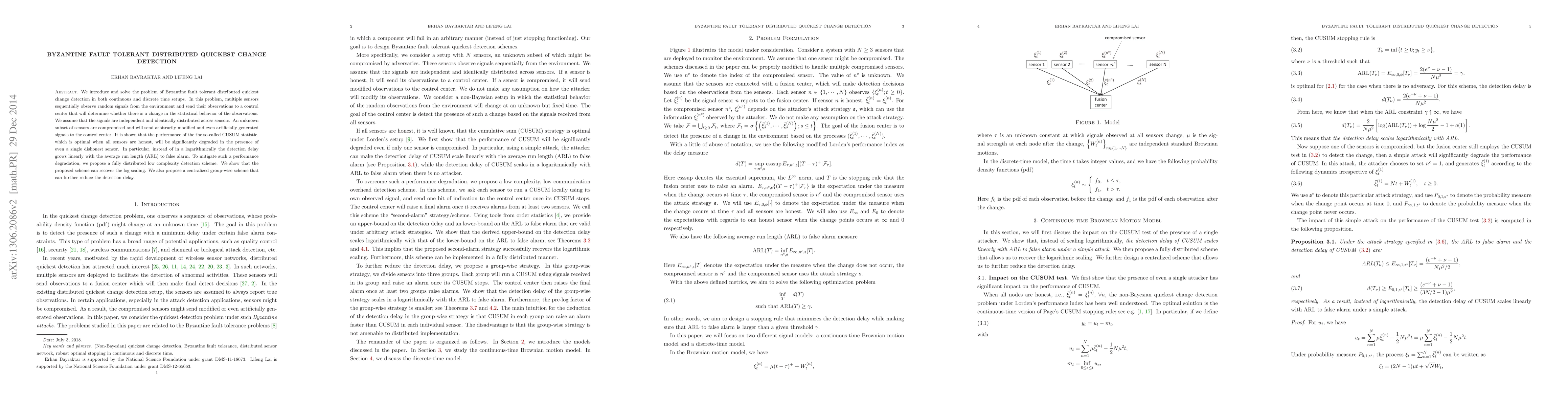 We introduce and solve the problem of Byzantine fault tolerant distributed quickest change detection in both continuous and discrete time setups. In this problem, multiple sensors sequentially observe random signals from the environment and send their observations to a control center that will determine whether there is a change in the statistical behavior of the observations. We assume that the signals are independent and identically distributed across sensors. An unknown subset of sensors are compromised and will send arbitrarily modified and even artificially generated signals to the control center. It is shown that the performance of the the so-called CUSUM statistic, which is optimal when all sensors are honest, will be significantly degraded in the presence of even a single dishonest sensor. In particular, instead of in a logarithmically the detection delay grows linearly with the average run length (ARL) to false alarm. To mitigate such a performance degradation, we propose a fully distributed low complexity detection scheme. We show that the proposed scheme can recover the log scaling. We also propose a centralized group-wise scheme that can further reduce the detection delay.