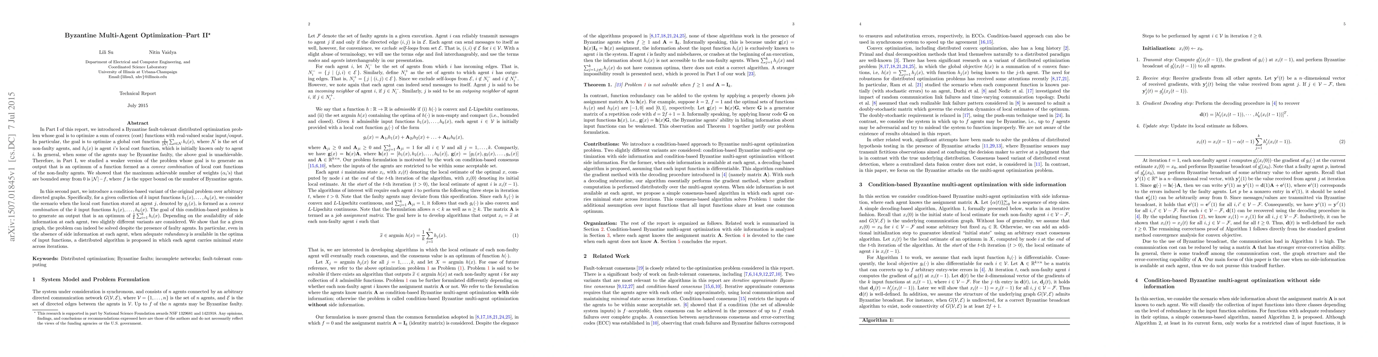 In Part I of this report, we introduced a Byzantine fault-tolerant distributed optimization problem whose goal is to optimize a sum of convex (cost) functions with real-valued scalar input/ouput. In this second part, we introduce a condition-based variant of the original problem over arbitrary directed graphs. Specifically, for a given collection of $k$ input functions $h_1(x), \ldots, h_k(x)$, we consider the scenario when the local cost function stored at agent $j$, denoted by $g_j(x)$, is formed as a convex combination of the $k$ input functions $h_1(x), \ldots, h_k(x)$. The goal of this condition-based problem is to generate an output that is an optimum of $\frac{1}{k}\sum_{i=1}^k h_i(x)$. Depending on the availability of side information at each agent, two slightly different variants are considered. We show that for a given graph, the problem can indeed be solved despite the presence of faulty agents. In particular, even in the absence of side information at each agent, when adequate redundancy is available in the optima of input functions, a distributed algorithm is proposed in which each agent carries minimal state across iterations.