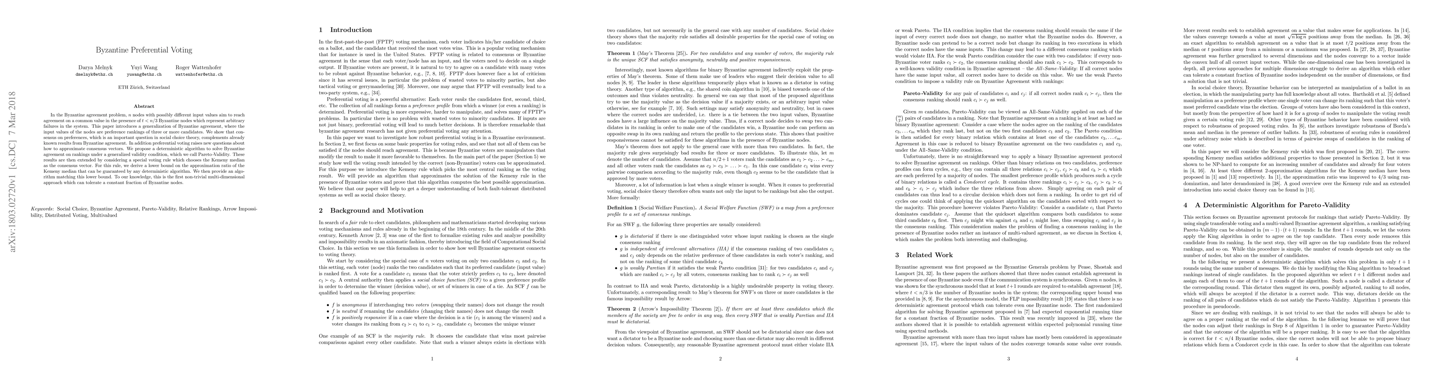 In the Byzantine agreement problem, n nodes with possibly different input values aim to reach agreement on a common value in the presence of t < n/3 Byzantine nodes which represent arbitrary failures in the system. This paper introduces a generalization of Byzantine agreement, where the input values of the nodes are preference rankings of three or more candidates. We show that consensus on preferences, which is an important question in social choice theory, complements already known results from Byzantine agreement. In addition preferential voting raises new questions about how to approximate consensus vectors. We propose a deterministic algorithm to solve Byzantine agreement on rankings under a generalized validity condition, which we call Pareto-Validity. These results are then extended by considering a special voting rule which chooses the Kemeny median as the consensus vector. For this rule, we derive a lower bound on the approximation ratio of the Kemeny median that can be guaranteed by any deterministic algorithm. We then provide an algorithm matching this lower bound. To our knowledge, this is the first non-trivial multi-dimensional approach which can tolerate a constant fraction of Byzantine nodes.
