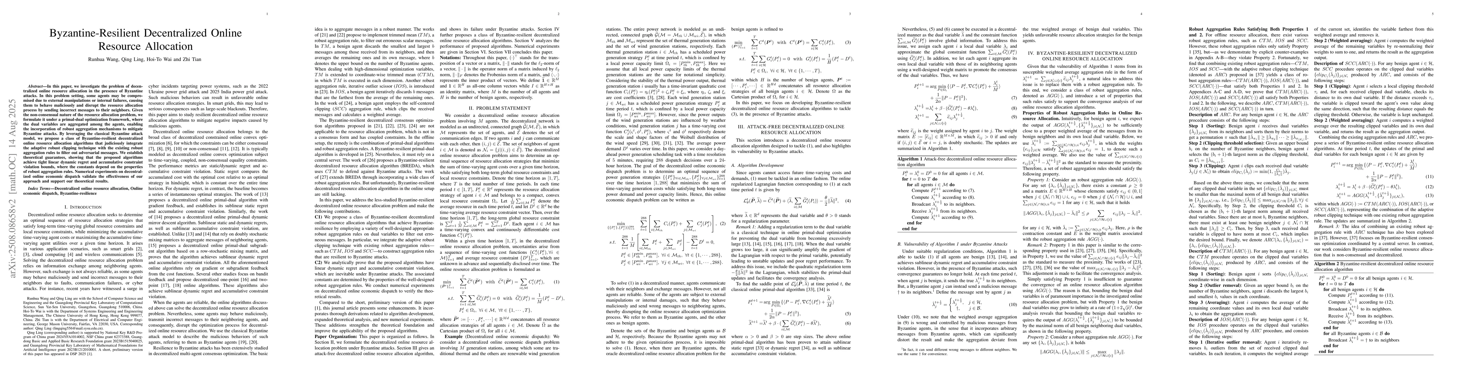 In this paper, we investigate the problem of decentralized online resource allocation in the presence of Byzantine attacks. In this problem setting, some agents may be compromised due to external manipulations or internal failures, causing them to behave maliciously and disrupt the resource allocation process by sending incorrect messages to their neighbors. Given the non-consensual nature of the resource allocation problem, we formulate it under a primal-dual optimization framework, where the dual variables are aggregated among the agents, enabling the incorporation of robust aggregation mechanisms to mitigate Byzantine attacks. By leveraging the classical Byzantine attack model, we propose a class of Byzantine-resilient decentralized online resource allocation algorithms that judiciously integrate the adaptive robust clipping technique with the existing robust aggregation rules to filter out adversarial messages. We establish theoretical guarantees, showing that the proposed algorithms achieve tight linear dynamic regret and accumulative constraint violation bounds, where the constants depend on the properties of robust aggregation rules. Numerical experiments on decentralized online economic dispatch validate the effectiveness of our approach and support our theoretical results.