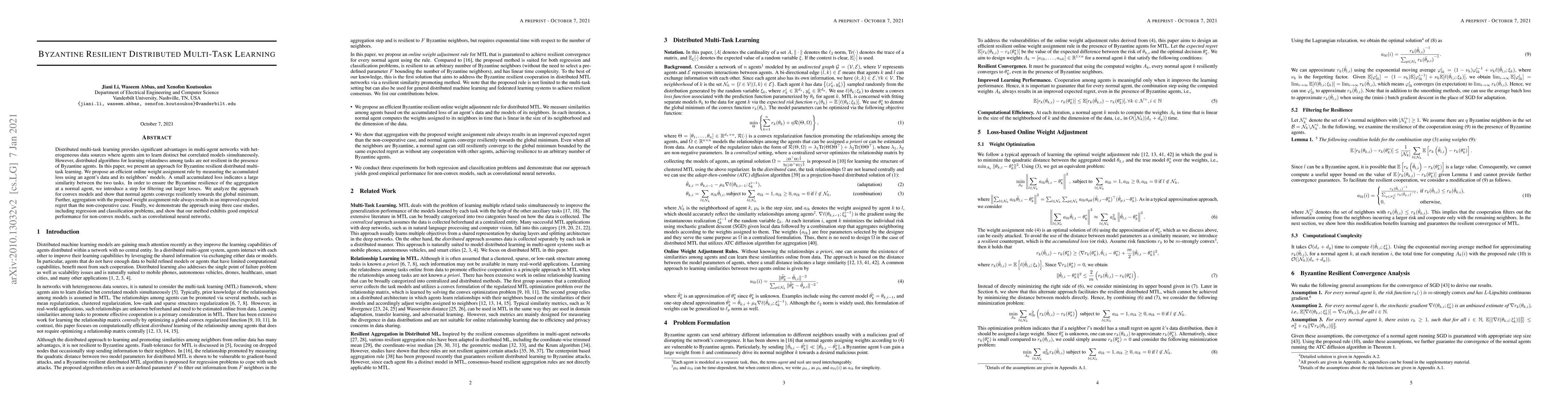 This paper proposes a Byzantine resilient distributed multi-task learning approach that uses an online weight assignment rule to measure task similarity and filter out larger losses for resilient aggregation. The method ensures convergence towards the global minimum and improved expected regret, demonstrated effectively in regression, classification, and convolutional neural networks.