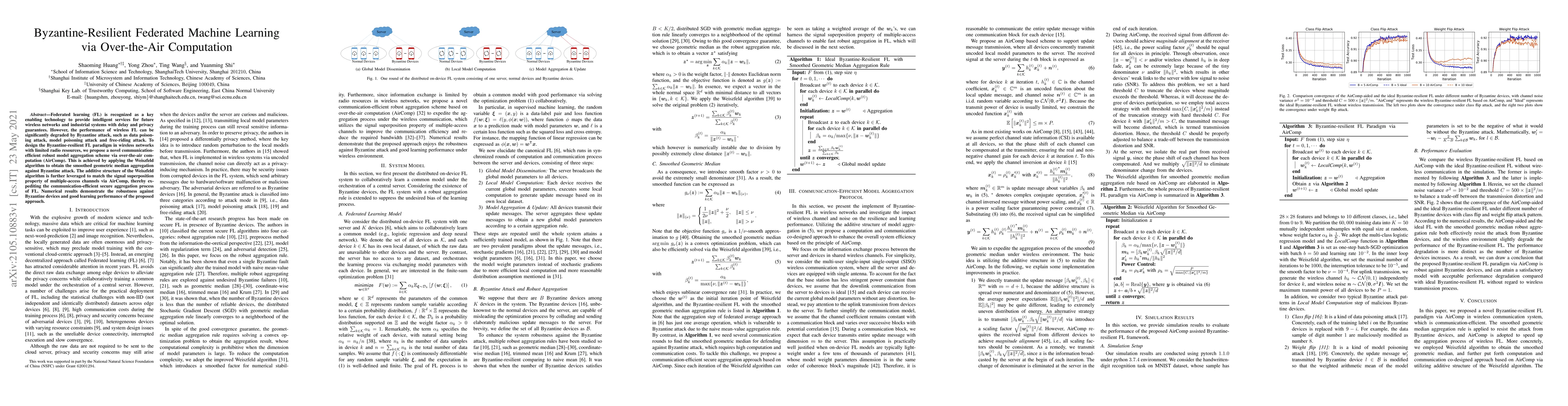 This paper proposes a Byzantine-resilient federated learning scheme using over-the-air computation (AirComp) and the Weiszfeld algorithm for robust model aggregation, demonstrating effective defense against Byzantine attacks and maintaining good learning performance.