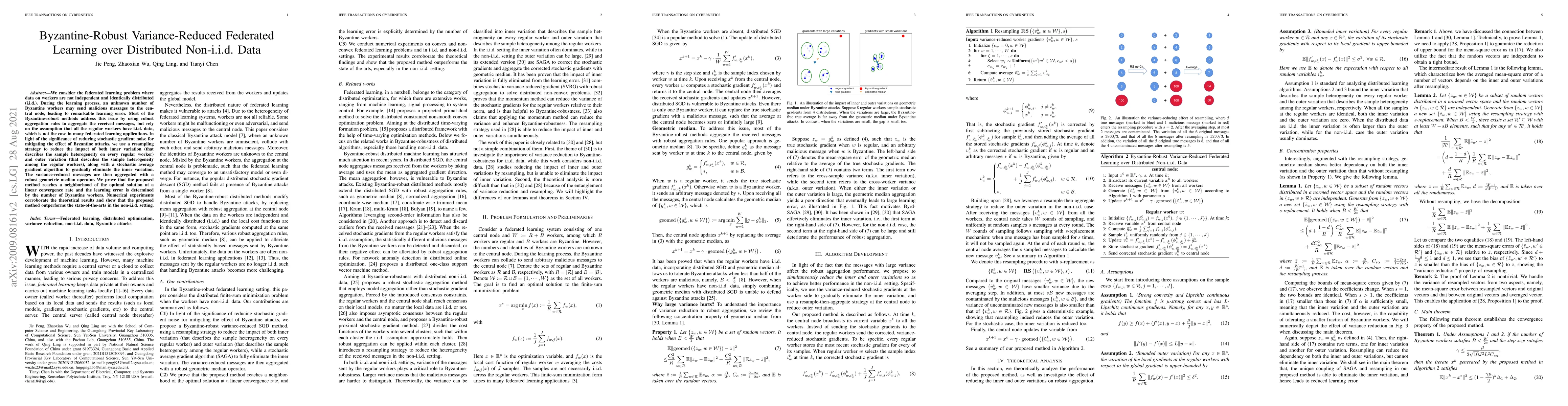 This paper proposes a Byzantine-robust variance-reduced federated learning method for non-i.i.d. data, addressing the challenge of malicious workers and sample heterogeneity. It combines a resampling strategy with a robust geometric median operator to achieve linear convergence and outperforms existing methods.
