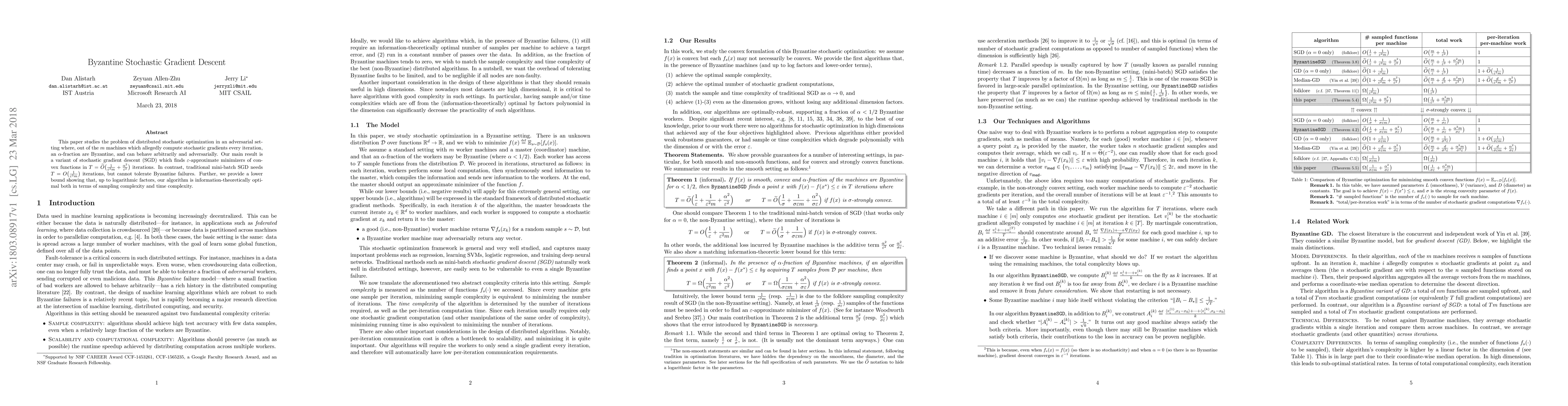 This paper proposes a Byzantine-resilient variant of stochastic gradient descent (SGD) that can handle adversarial nodes in a distributed optimization setting. The algorithm achieves $\varepsilon$-approximate minimizers in $\tilde{O}\big( \frac{1}{\varepsilon^2 m} + \frac{\alpha^2}{\varepsilon^2} \big)$ iterations, outperforming traditional SGD which lacks Byzantine fault tolerance.
