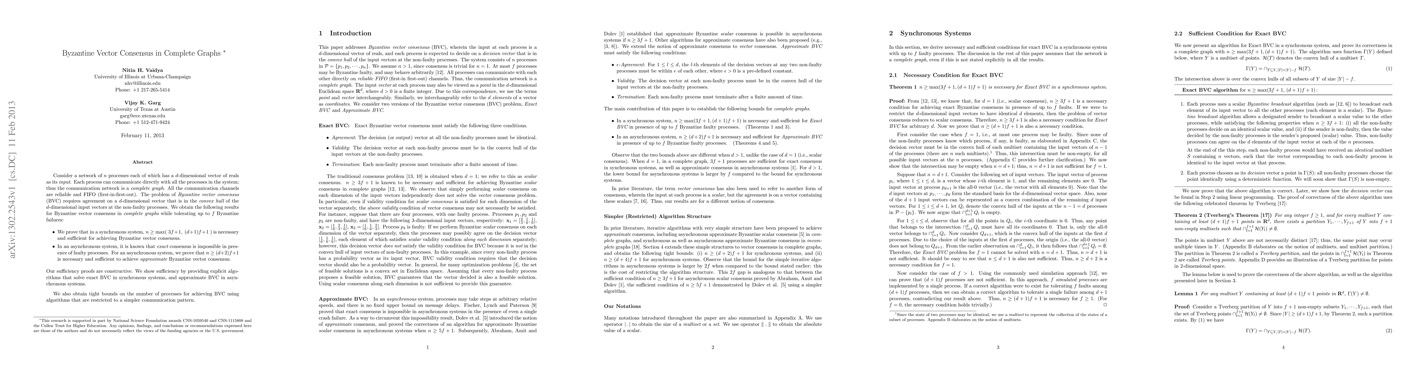This paper addresses Byzantine vector consensus in complete graphs, proving necessary and sufficient conditions for achieving consensus in both synchronous and asynchronous systems. It provides constructive algorithms for exact consensus in synchronous systems and approximate consensus in asynchronous systems.