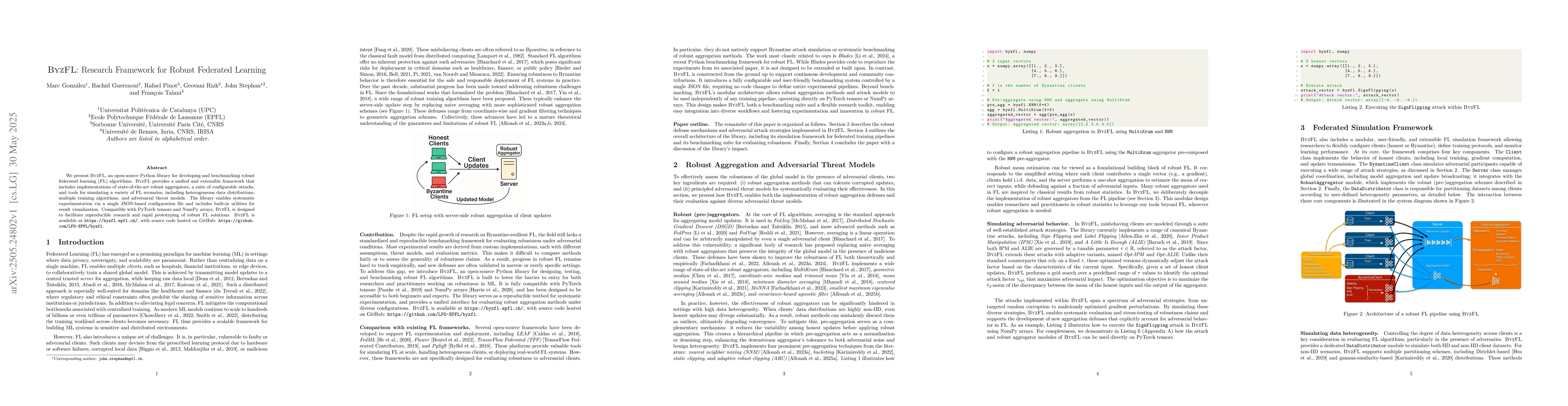 ByzFL is an open-source Python library for robust federated learning that facilitates reproducible research and rapid prototyping of FL solutions, providing a unified framework with implementations of state-of-the-art aggregators and tools for simulating various FL scenarios.