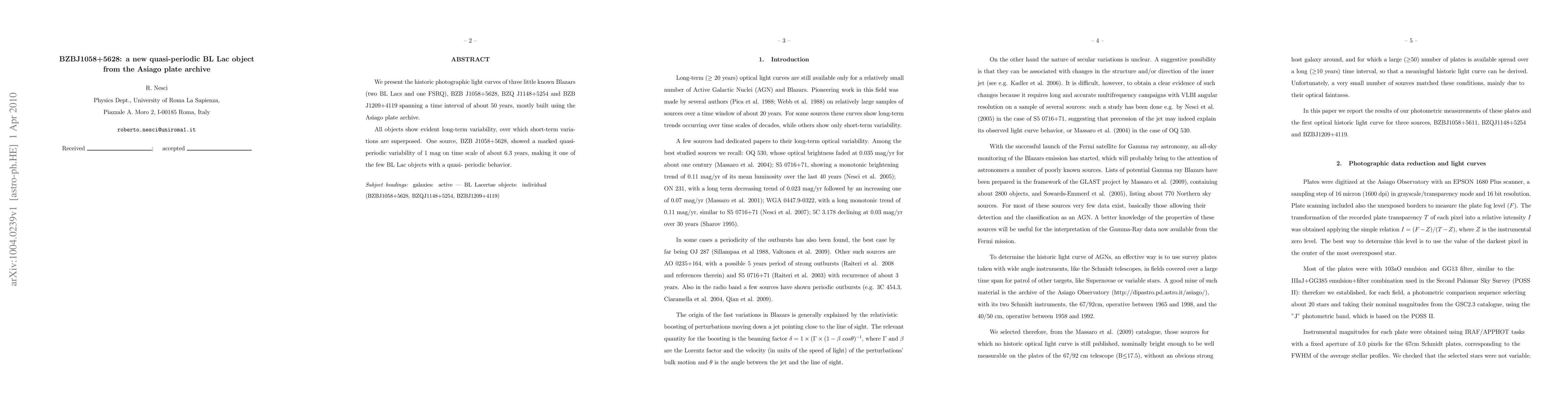 The research presents historic photographic light curves of three Blazars (BZBJ1058+5628, BZQJ1148+5254, and BZBJ1209+4119) over approximately 50 years, primarily using the Asiago plate archive.