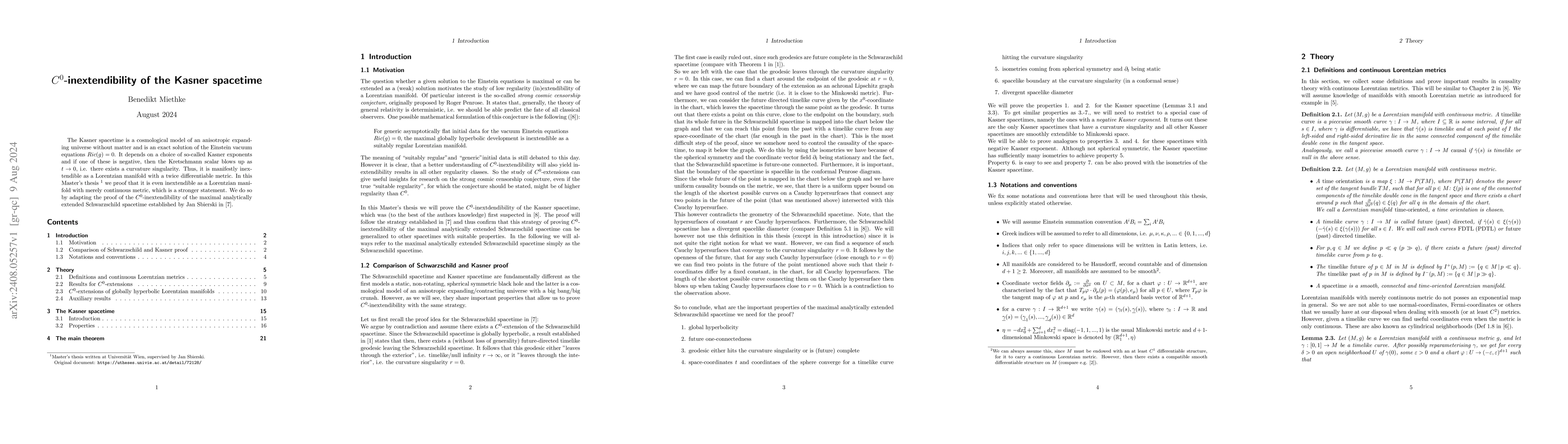 The Kasner spacetime is a cosmological model of an anisotropic expanding universe without matter and is an exact solution of the Einstein vacuum equations Ric(g) = 0. It is manifestly inextendible as a Lorentzian manifold with a twice differentiable metric. In this thesis we proof that it is even inextendible as a Lorentzian manifold with merely continuous metric, which is a stronger statement. We do so by adapting the proof of the $C^0$-inextendibility of the maximal analytically extended Schwarzschild spacetime established by Jan Sbierski.