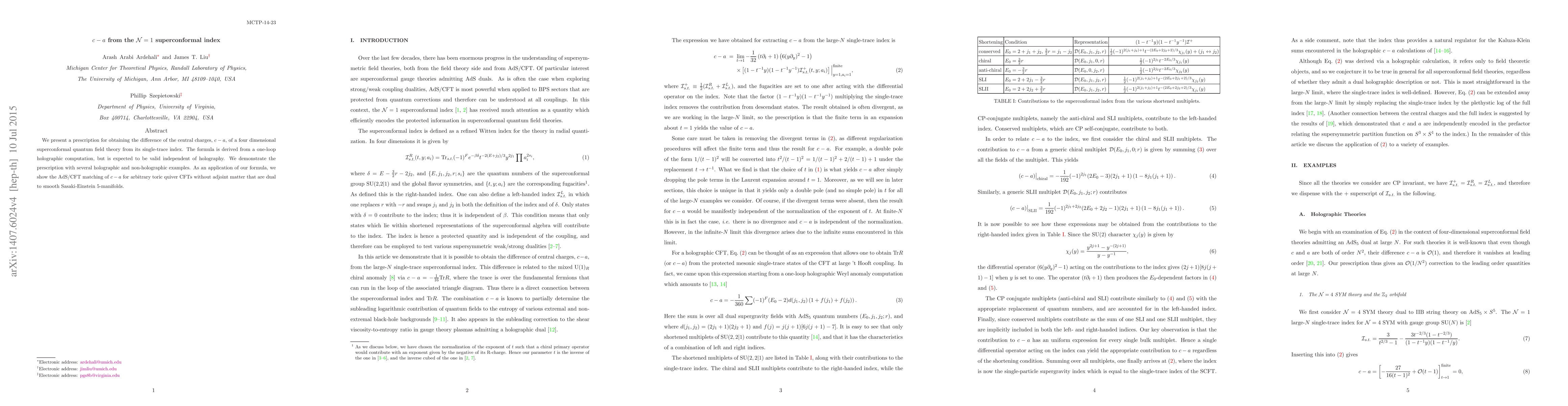 Researchers developed a method to calculate the difference of central charges (c-a) in 4D superconformal field theories from their single-trace index, with implications for AdS/CFT correspondence.