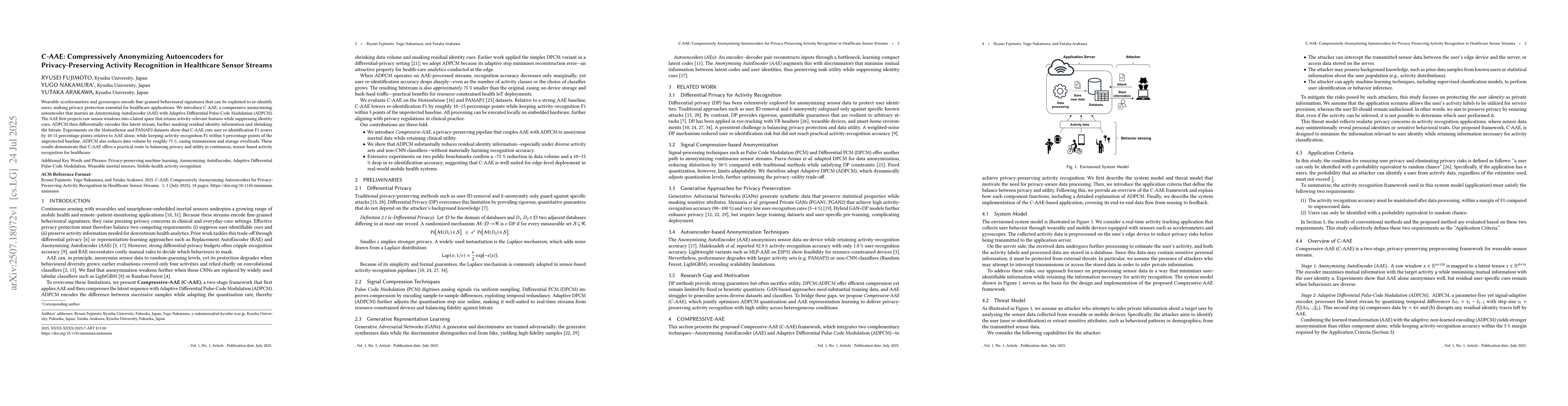 Wearable accelerometers and gyroscopes encode fine-grained behavioural signatures that can be exploited to re-identify users, making privacy protection essential for healthcare applications. We introduce C-AAE, a compressive anonymizing autoencoder that marries an Anonymizing AutoEncoder (AAE) with Adaptive Differential Pulse-Code Modulation (ADPCM). The AAE first projects raw sensor windows into a latent space that retains activity-relevant features while suppressing identity cues. ADPCM then differentially encodes this latent stream, further masking residual identity information and shrinking the bitrate. Experiments on the MotionSense and PAMAP2 datasets show that C-AAE cuts user re-identification F1 scores by 10-15 percentage points relative to AAE alone, while keeping activity-recognition F1 within 5 percentage points of the unprotected baseline. ADPCM also reduces data volume by roughly 75 %, easing transmission and storage overheads. These results demonstrate that C-AAE offers a practical route to balancing privacy and utility in continuous, sensor-based activity recognition for healthcare.