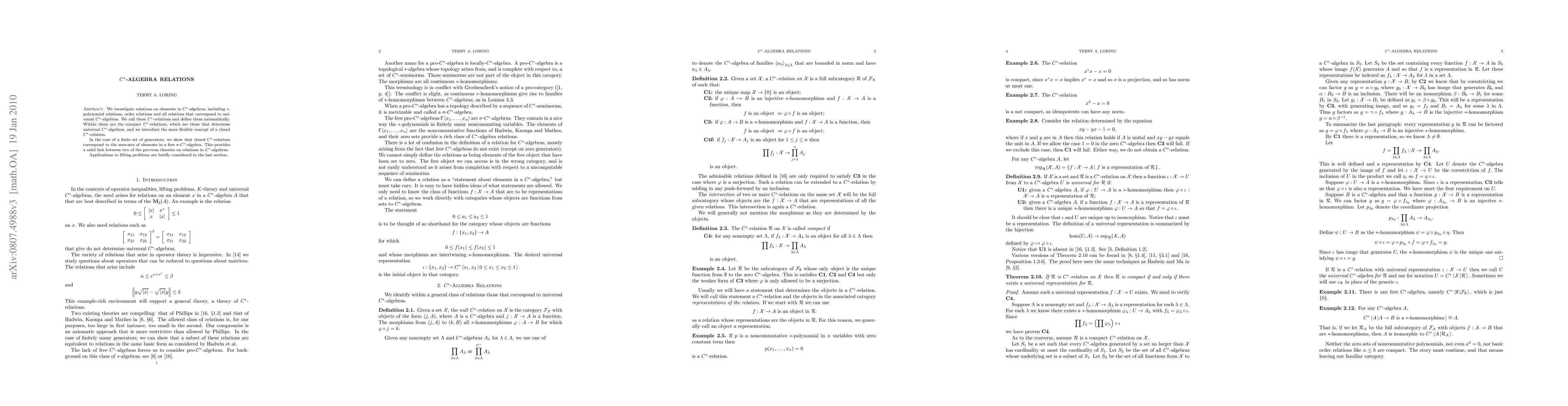 This paper defines C*-relations in C*-algebras, including *-polynomial and order relations, and introduces compact and closed C*-relations. It establishes a connection between closed C*-relations and zero-sets in free sigma-C*-algebras, and briefly discusses applications to lifting problems.