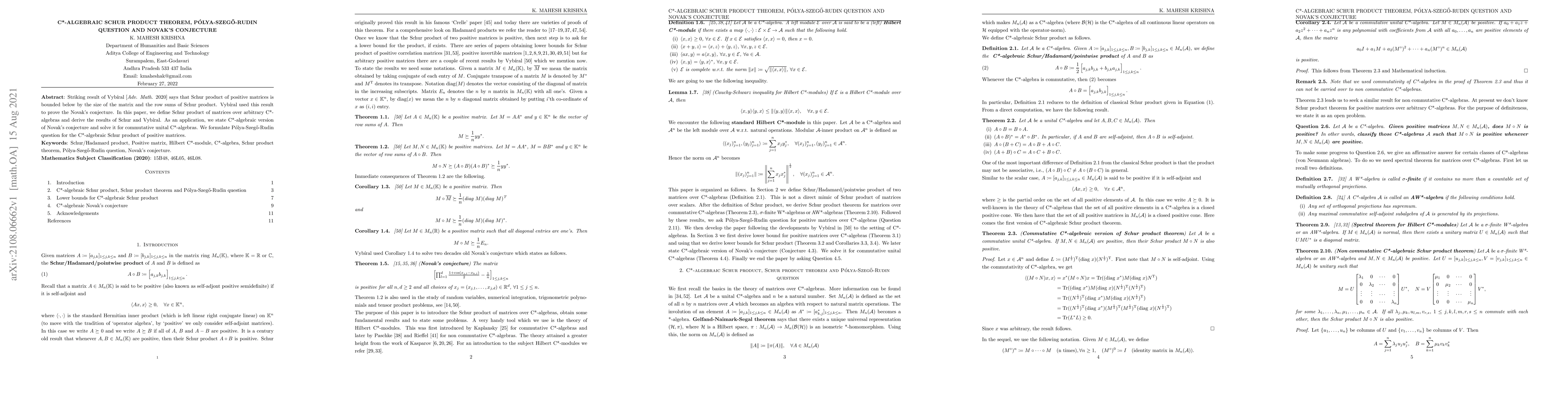 This paper extends the Schur product theorem to C*-algebras, replicating results by Schur and Vybíral. It also applies these findings to solve Novak's conjecture for commutative unital C*-algebras. Furthermore, it poses a C*-algebraic version of the Pólya-Szegő-Rudin question.