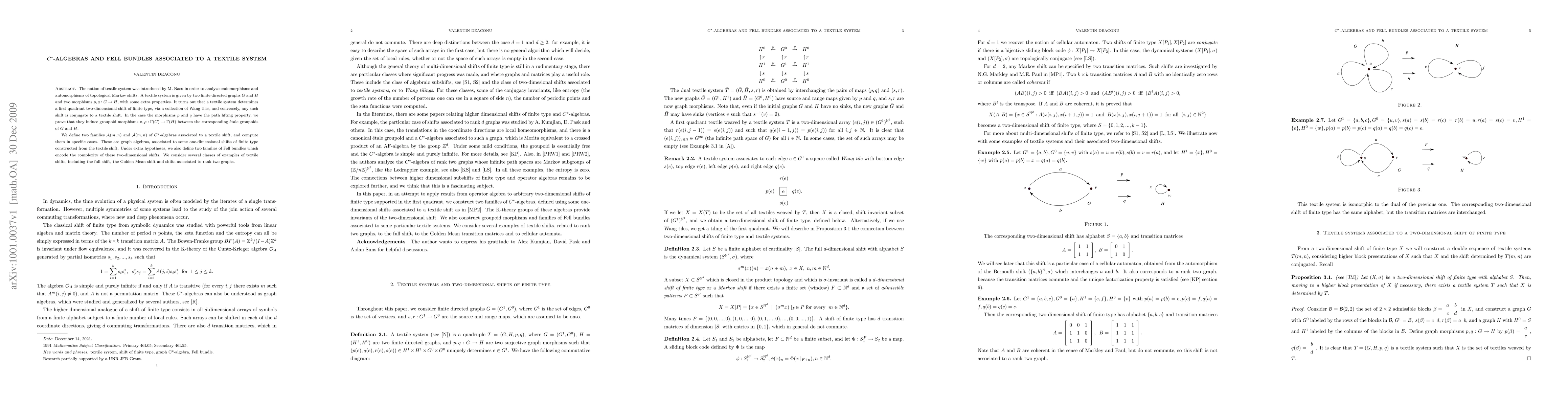 The notion of textile system was introduced by M. Nasu in order to analyze endomorphisms and automorphisms of topological Markov shifts. A textile system is given by two finite directed graphs $G$ and $H$ and two morphisms $p,q:G\to H$, with some extra properties. It turns out that a textile system determines a first quadrant two-dimensional shift of finite type, via a collection of Wang tiles, and conversely, any such shift is conjugate to a textile shift. In the case the morphisms $p$ and $q$ have the path lifting property, we prove that they induce groupoid morphisms $\pi, \rho:\Gamma(G)\to \Gamma(H)$ between the corresponding \'etale groupoids of $G$ and $H$. We define two families ${\mathcal A}(m,n)$ and $\bar{\mathcal A}(m,n)$ of $C^*$-algebras associated to a textile shift, and compute them in specific cases. These are graph algebras, associated to some one-dimensional shifts of finite type constructed from the textile shift. Under extra hypotheses, we also define two families of Fell bundles which encode the complexity of these two-dimensional shifts. We consider several classes of examples of textile shifts, including the full shift, the Golden Mean shift and shifts associated to rank two graphs.