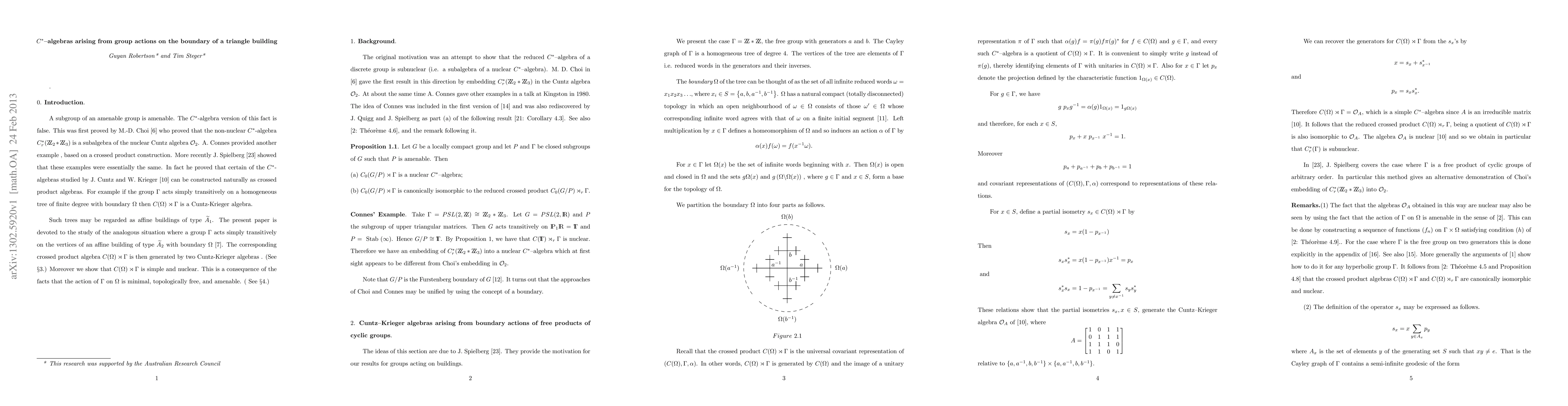 A subgroup of an amenable group is amenable. The $C^*$-algebra version of this fact is false. This was first proved by M.-D. Choi who proved that the non-nuclear $C^*$-algebra $C^*_r(\ZZ_2*\ZZ_3)$ is a subalgebra of the nuclear Cuntz algebra ${\cal O}_2$. A. Connes provided another example, based on a crossed product construction. More recently J. Spielberg [23] showed that these examples were essentially the same. In fact he proved that certain of the $C^*$-algebras studied by J. Cuntz and W. Krieger [10] can be constructed naturally as crossed product algebras. For example if the group $\Gamma$ acts simply transitively on a homogeneous tree of finite degree with boundary $\Omega$ then $\cross$ is a Cuntz-Krieger algebra. Such trees may be regarded as affine buildings of type $\widetilde A_1$. The present paper is devoted to the study of the analogous situation where a group $\G$ acts simply transitively on the vertices of an affine building of type $\widetilde A_2$ with boundary $\O$. The corresponding crossed product algebra $\cross$ is then generated by two Cuntz-Krieger algebras. Moreover we show that $\cross$ is simple and nuclear. This is a consequence of the facts that the action of $\G$ on $\O$ is minimal, topologically free, and amenable.