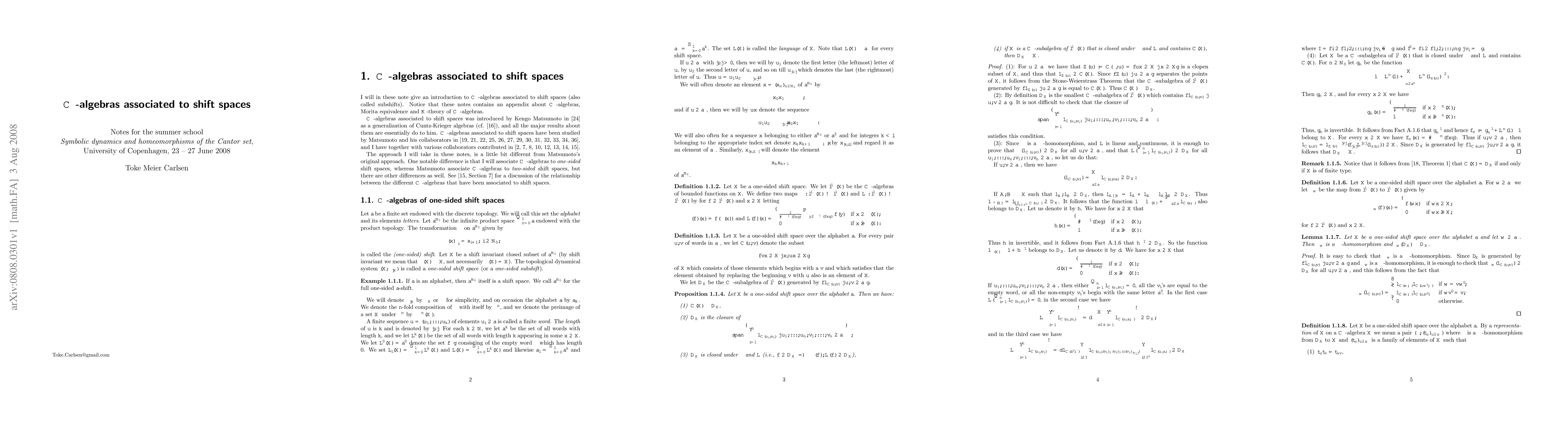 These are some notes I wrote for the summer school "Symbolic dynamics and homeomorphisms of the Cantor set" at the University of Copenhagen, 23 - 27 June 2008. The notes contain the definition of the C*-algebra associated to a shift space and some basic facts about these. The notes furthermore contain a proof of the fact that the C*-algebra associated to a shift space is a one-sided conjugacy invariant, and a proof of the fact that the Morita equivalence class of the C*-algebra associated to a shift space is a two-sided conjugacy and a flow invariant. The notes also contain a section (without proofs) about the K-theory of C*-algebras associated to shift spaces. The notes are written for people without a background in operator algebra and contains a short appendix about C*-algebras, Morita equivalence and K-theory of C*-algebras.
