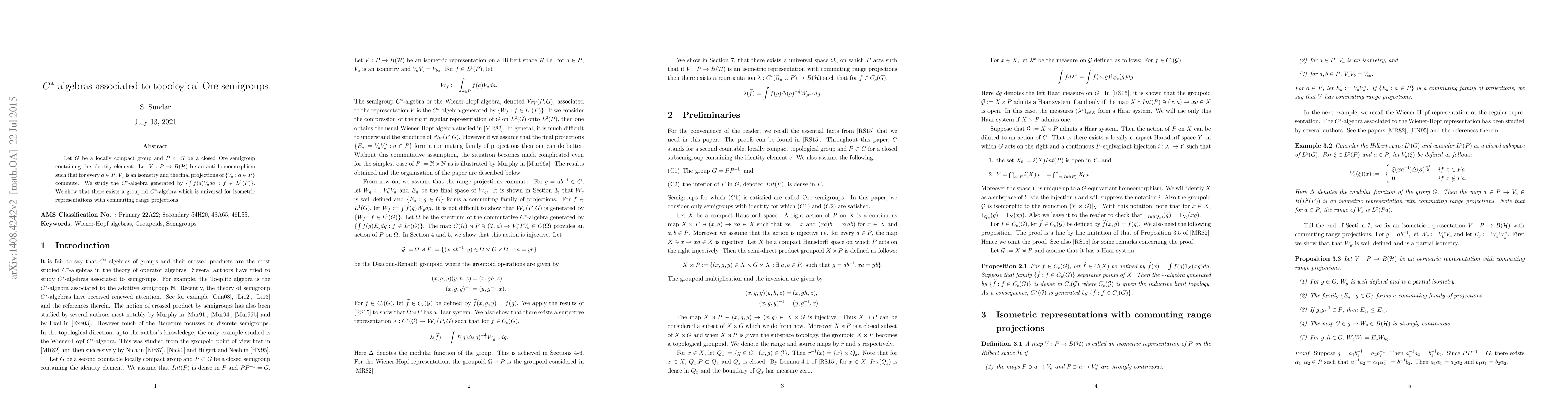 A research paper studies $C^*$-algebras associated with topological Ore semigroups, finding a universal algebra that $ extit{mathematical} $ contains as a quotient when the semigroup is locally compact.