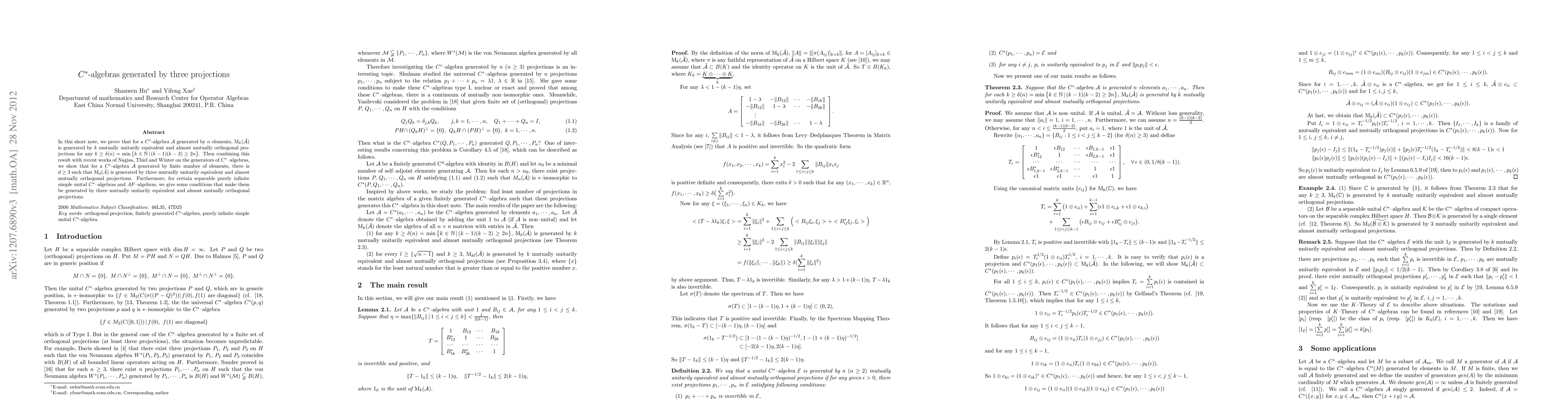 In this short note, we prove that for a $C^*$-algebra $\aa$ generated by $n$ elements, $M_{k}(\tilde{\aa})$ is generated by $k$ mutually unitarily equivalent and almost mutually orthogonal projections for any $k\ge \de(n)=\min\big\{k\in\mathbb N\,|\,(k-1)(k-2)\ge 2n\big\}$. Then combining this result with recent works of Nagisa, Thiel and Winter on the generators of $C^*$--algebras, we show that for a $C^*$-algebra $\aa$ generated by finite number of elements, there is $d\ge 3$ such that $M_d(\tilde A)$ is generated by three mutually unitarily equivalent and almost mutually orthogonal projections. Furthermore, for certain separable purely infinite simple unital $C^*$--algebras and $AF$--algebras, we give some conditions that make them be generated by three mutually unitarily equivalent and almost mutually orthogonal projections.