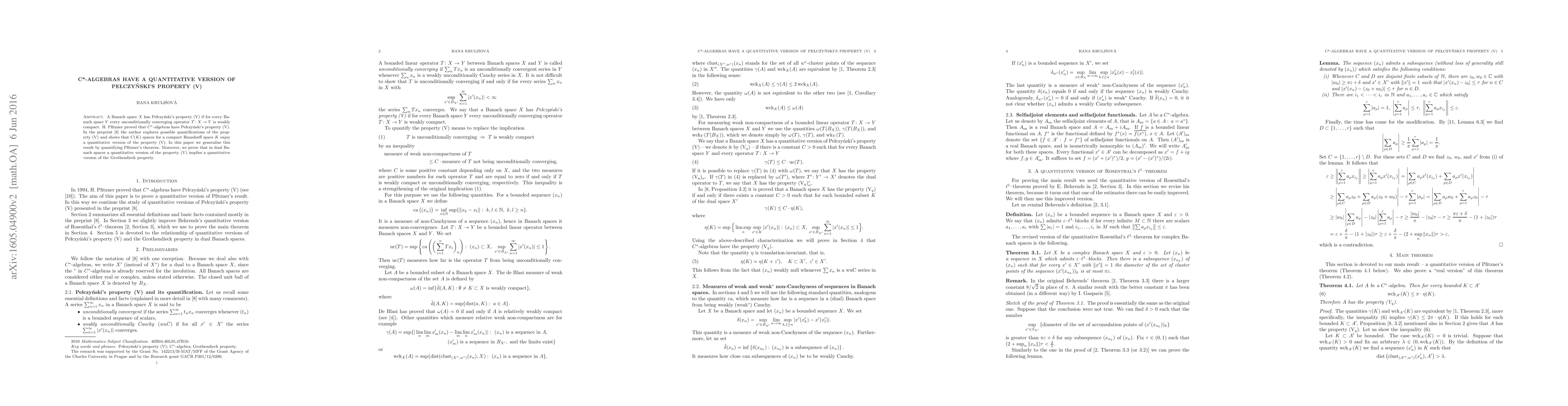 A Banach space X has Pelczynski's property (V) if for every Banach space Y every unconditionally converging operator T: X -> Y is weakly compact. H. Pfitzner proved that C*-algebras have Pelczynski's property (V). In the preprint "H. Krulisova: Quantification of Pelczynski's property (V)" the author explores possible quantifications of the property (V) and shows that C(K) spaces for a compact Hausdorff space K enjoy a quantitative version of the property (V). In this paper we generalize this result by quantifying Pfitzner's theorem. Moreover, we prove that in dual Banach spaces a quantitative version of the property (V) implies a quantitative version of the Grothendieck property.