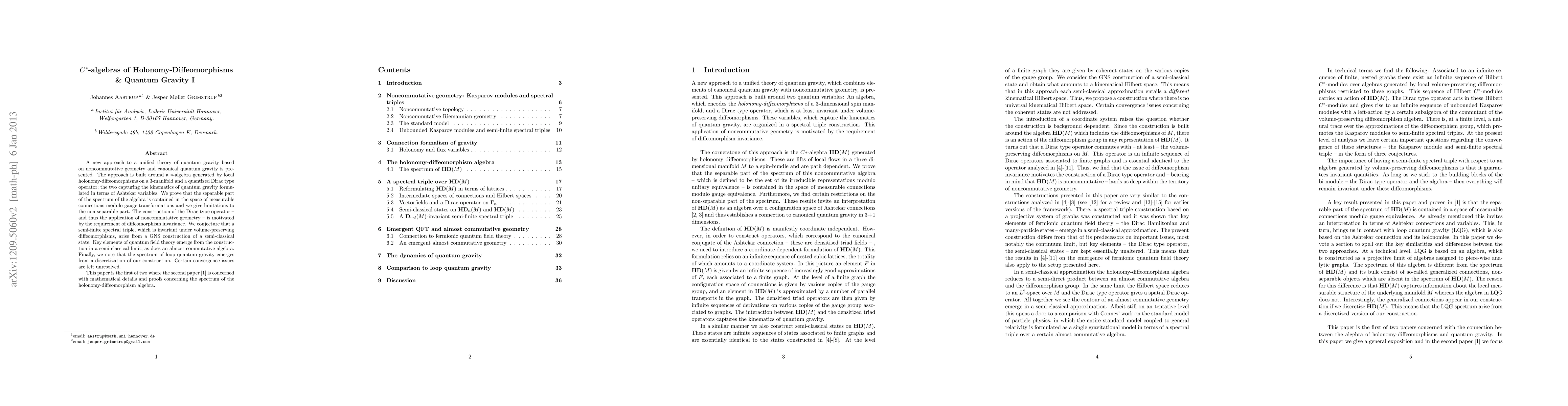 A new approach to a unified theory of quantum gravity based on noncommutative geometry and canonical quantum gravity is presented. The approach is built around a *-algebra generated by local holonomy-diffeomorphisms on a 3-manifold and a quantized Dirac type operator; the two capturing the kinematics of quantum gravity formulated in terms of Ashtekar variables. We prove that the separable part of the spectrum of the algebra is contained in the space of measurable connections modulo gauge transformations and we give limitations to the non-separable part. The construction of the Dirac type operator -- and thus the application of noncommutative geometry -- is motivated by the requirement of diffeomorphism invariance. We conjecture that a semi-finite spectral triple, which is invariant under volume-preserving diffeomorphisms, arise from a GNS construction of a semi-classical state. Key elements of quantum field theory emerge from the construction in a semi-classical limit, as does an almost commutative algebra. Finally, we note that the spectrum of loop quantum gravity emerges from a discretization of our construction. Certain convergence issues are left unresolved. This paper is the first of two where the second paper is concerned with mathematical details and proofs concerning the spectrum of the holonomy-diffeomorphism algebra.