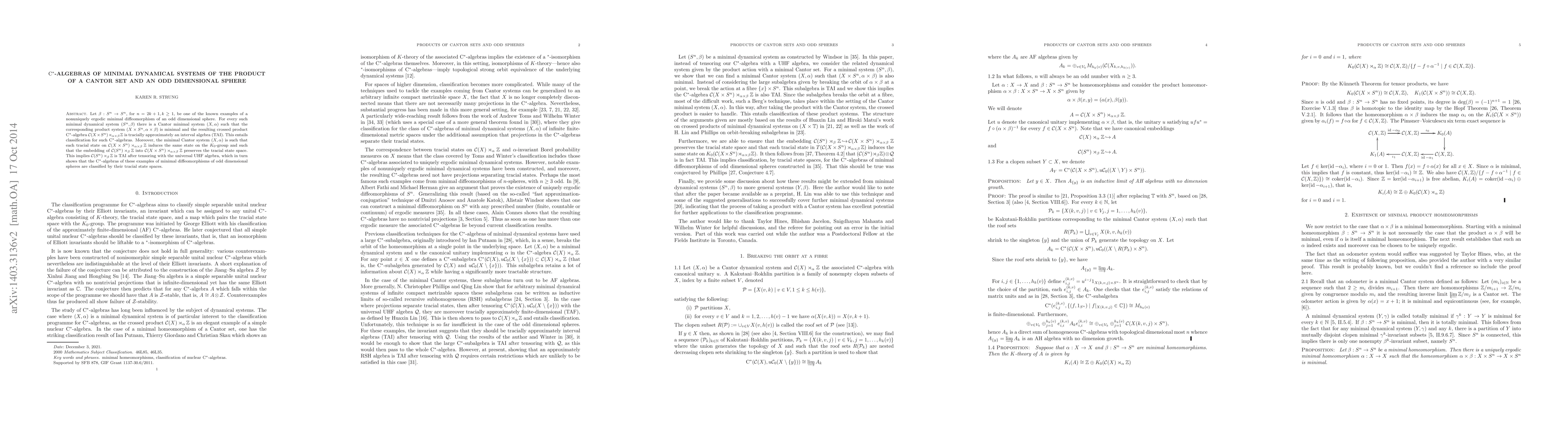 Let \beta : S^n \to S^n, for n = 2k + 1, k \geq 1, be one of the known examples of a non-uniquely ergodic minimal diffeomorphism of an odd dimensional sphere. For every such minimal dynamical system (S^n, \beta) there is a Cantor minimal system (X, \alpha) such that the corresponding product system (X x S^n, \alpha x \beta) is minimal and the resulting crossed product C*-algebra C(X x S^n) \rtimes_{\alpha x \beta} \mathbb{Z} is tracially approximately an interval algebra (TAI). This entails classification for such C*-algebras. Moreover, the minimal Cantor system (X, \alpha) is such that each tracial state on C(X x S^n) \rtimes_{\beta} \mathbb{Z} induces the same state on the K_0-group and such that the embedding of C(S^n) \rtimes_{\beta} \mathbb{Z} into C(X x S^n) \rtimes_{\alpha x \beta} \mathbb{Z} preserves the tracial state space. This implies C(S^n) \rtimes_{\beta} \mathbb{Z} is TAI after tensoring with the universal UHF algebra, which in turn shows that the C*-algebras of these examples of minimal diffeomorphisms of odd dimensional spheres are classified by their tracial state spaces.