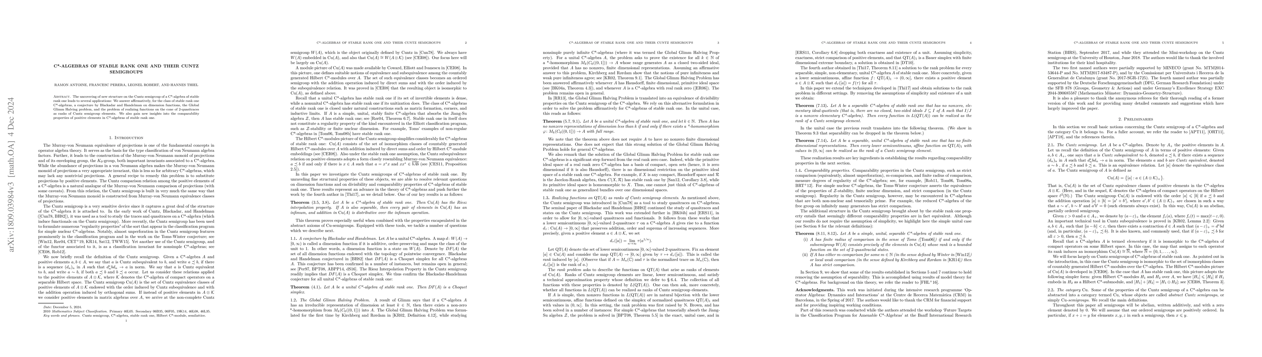 The uncovering of new structure on the Cuntz semigroup of a C*-algebra of stable rank one leads to several applications: We answer affirmatively, for the class of stable rank one C*-algebras, a conjecture by Blackadar and Handelman on dimension functions, the Global Glimm Halving problem, and the problem of realizing functions on the cone of 2-quasitraces as ranks of Cuntz semigroup elements. We also gain new insights into the comparability properties of positive elements in C*-algebras of stable rank one.